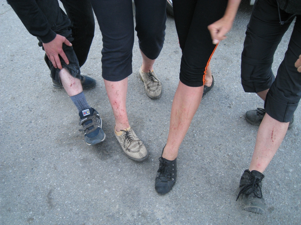 Ровно в 9.00 караван из шести машин автофорума М-49 тронулся в путь.Настроение было приподнятым.Долго ли ехали-коротко.Да че там сказки сказывать Мне конец пришел сразу,с первого метра подъема.Пытаешься сделать шаг,а камни вместе с тобой ползут вниз.И как белка в колесе по сыпуну+ненавистное солнце.Короче путь наверх не помню Дальше первых останцов (на карте обозначен как привал)ребята пошли без меня.Тут рассказывайте сами.Сидели с дочей снимали их подьем.Честно говоря не понимала,как они преодолеют последние вертикальные 200-300 метров по сыпуну? Звук там потрясающий,на огромном расстоянии было слышно как они разговаривают.Сняла,как СауроН и Dark Ski обгоняя друг друг быстро лезли на скалы. Супер! При спуске ,уже полегчало,поэтому наслаждалась видом.Скалами,которые при подъеме опползала и даже их не видела. Доча в какой-то момент устала падать и плача просила вызвать МЧС. Иногда прерывались на нехорошие слова,когда сыпун срывает тебя вниз и пытаешься зацепится,за любую растительность .Ну хоть не сломали себе ничего и то хорошо.Не жалею. Внизу нас ждала Софи( тихо посапывая в машине),asz67 приготовил костерок для обеда.Не стали отступать от автотемы и лагерь разбили прямо возле трассы.Иногда с горы слышались голоса наших. Приближение команды услышали по крикам:"Пиить","Водыы". А потом начался отдых! Это просто праздник какой-то!Dark Ski сделал памятную надпись М-49 на трассе.Фото на память и путь домой. Что творили "канадцы" перед постом описывать не буду.Просто отдам запись в личное пользование участникам. Там же рассказаз ASSа про то как ему испортили машину.Тут же Dark Ski и СауроН провели спецрасследование и вынесли вердикт ,что надо искать злодея на "Ламборджини Дьяболо"(надеюсь не перепутала буквы?),причем зеленого цвета. Вот следопыты(обломанные ветки,упавшие листья-вот их ориентиры Теперь ваш рассказ,как преодолевали последний км. Заранее прошу прощения, что фигуры участников прийдется искать на гряде и скалах,но снимала с огромного расстояния от них. Сообщение отредактировал ТИГРА - 18.8.2010, 9:55 -------------------- Надеюсь на Бога и верю в свои силы!