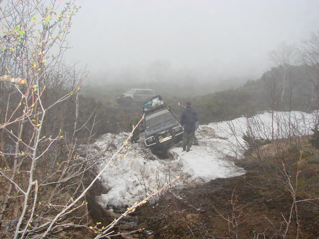 Тут в голове всплывают воспоминания о прошлогодних моих поездках на Светлую. Выношу предложениие. Аргументировав его тем, что там рыбалка есть без проигрышная. Тут тебе и краб есть, да и Ерша потягать можно. Если повезет, то и треска будет, или палтус попадется. А в прошлом году мы там вобще горбушу блеснили с берега. Тогда у меня восторг был не описуемый! Всю жизнь живу в Магадане, а на блесну в море с берега красную рыбу не ловил никогда. Ну и самым важным аргументом стала дорога. Расстояние небольшое, а по сложности - такую ещё поискать надо. Тут тебе и триал, и водные преграды, и тундряк болотистый. Вобщем решили - едем в пятницу после обеда и до воскресенья. Как всегда в планы вмешалась наша "Лондонская" погода. От намеченной цели не отказываемся. Выдвигаемся в составе трех автомобилей (два Эскудика и Паджерик), ОДИНАДЦАТИ человек (включая детей) и собака. К месту встречи и загрузки я приехал позже всех, за что и получил - весь тяжелый бутор загрузили в маленького белого Эскудика Подъезжаем к ручью, и тут я вижу, что в прошлом году как-то суше было. Робко предполагаем, что при подъеме будет весело. Мало того что валуны, так ещё и раскисший грунт будет. Так и вышло. Медленно шкрябаясь вверх, наслаждаюсь работой недавно установленного LCD редуктора. Теперь не приходится накатом брать крутые подъёмы и вскарабкиваться на валуны. Машина едет и на малых оборотах, несмотря на изрядно потрепаную резину "Медведь". В мыслях закрадывается идея установить подключаемую блокировку ARB в передний редуктор. Вспоминаю цену Через некоторое время вырываюсь вперед, благодаря малому размеру эскудика. Объезжаю засадное место под самым деревом. У мастодонтов не получается - не пролезают Привод вытащили, стоим думаем как быть дальше. Пока связь не пропала созваниваться с друзьями в городе и просить их подвезти к началу тропы привод, или разворачиваться кому-то из нас и ехать за приводом. Решаем не делать ни того, ни другого. По расчетам мы уже прошли больше половины подъема. На верху тундряк, а дальше вниз до самой бухты дорога гораздо легче (это если вниз ехать)) ). Двигаемся дальше. Темный эскудик - аля МАРК II, на заднем приводе. Едет сам, на проблемных участках лебедкой подтягиваемся или Паджерик выдергивает Вышли на тундру. Туман такой, что я потерял из виду своего штурмана. Едем интуитивно. Следов на тундре столько, что можно заблудиться. Тут и Трэкол и 66 и ГТТ. Каждый едет своей дорогой. Нам по следу 66. Тундряк проходим очень быстро. На всем пути мне попалась одна линза из которой выбрались зацепившись лебедкой за мощный зад друга Спуск к бухте не предвещал ничего плохого, пока не уперлись в снег. С двух сторон стланик, не объедешь, только вперед. Мастадонты пошли! Я за ними, уже по колее. Глаза боятся, а машины едут)). Через некоторое расстояние подъезжаем к месту где должен быть ручей. Его нет - опять большой сугроб. Начинаю ехать первым и тут LCD сыграл злую шутку. Проезжаем не только с передним, но и с правым большим боковым уклоном. Срабатывает самоблок и зад уходит в право по склону. Пытаюсь поставить машину перпендикулярно бокового уклона, как под задним правым колесом проваливается снег, да так что морда стала смотреть чуть-ли не в небо. Выбираюсь из машины и вижу под колесом ручей, который течет под этим сугробом. Правда в полутора метрах, под колесом. Быстро цепляем л