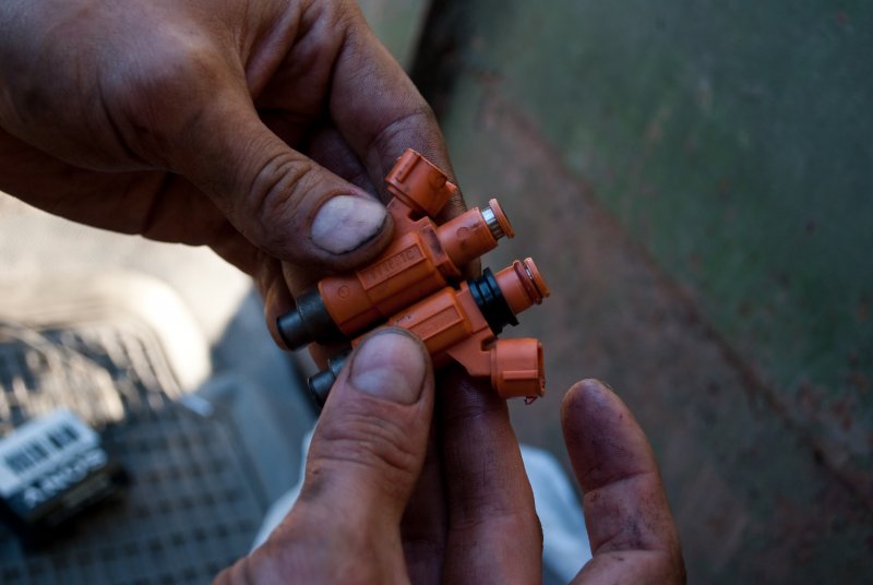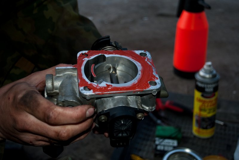 Итак, имеем Эскудо ТL52W, двигатель J20A. Машина тупая, педаль газа тяжелая, заводится - когда как. Для начала готовим необходимый инвентарь : ключи, головки (длинные, короткие)(8,10,12), удленители головок, трещетка, отвертки, пассатижи, ветошь,WD-40,Карбклинер, острый нож, герметик(черный или красный),небольшие ёмкости,кусок 15/15 прокладочного материала, например ПАРОНИТА, чистые пакеты - штук 5. Для чистки форсунок нам понадобятся провода, батарея на 4,5 вольт, кембрики, кнопка по типу замыкателя импульсного, трубка резиновая эластичная, зажимы как на топливных фильтрах. Как это всё собрать: делаем линию с импульсным выключателем (нажал -ток, отпустил - нет тока) - лучше делать подлиннее, для того что бы можно было нажимать ногой, на один конец закрепляем батарею, на другом - вставляем кембреки - диаметр-3 или 4 мм, можно изготовить из изоляции провода подходящего диаметра - суть та же. У форсунки два контакта длинной 10 мм, шириной 0,5 мм, высотой 3 мм. Подключая форсунку, разницы не будет плюс или минус. Снимаем распылитель на карбклинере - он диаметром примерно 10 мм. Смотрим на распылитель сверху, видим два отверстия, берем зажигалку и запаиваем их,берем нож и делаем срез от выпускного отверстия кверху - суть действий в следующем: необходимо сделать распыление не в бок а вверх. Надеваем распылитель на карбклинер, зажимаем зажимом проверям работу - бьет вверх? - хорошо! снизу не сифонит? - хорошо! Проверяем цепь - там где должна быть форсунка подключаем лампочку, нажимаем на кнопочку с частотой 3-5 раз/сек. Светит? хорошо! Импульсно? Хорошо! Вообще всю работу лучше делать в первой половине буднего дня - так если потерял какой болт, можно было в магазин сгонять. Отсоединяем клемму аккумулятора. Открываем лючок бензобака, снимаем крышку. Всё это для избавления от избытка давления в топл.магистрали. Снимаем рез.трубу воздуховода, отсоединяем все фишки от блока дрос.заслонки (их не перепутаете, они все разные). Пробрызгиваем болты WD,а конкретно,2 болта и 2 гайки крепежа БДЗ (то ли на 10, то ли на 12), 2 болтика(на 8+крест под отвертку) клапана холостого хода, трубки охл.жидкости и карт.газов. Снимаем тросики. Запомните положение гаек, чтобы потом не мучатся. Снимаем трубки ОЖ и воздушные трубки. Сразу подготовьте заглушки, можно болты подходящего диаметра. Откручиваем корпус дроссельной заслонки. Если прокладка осталась целой - хорошо, если нет - скалупываем с поверхностей все остатки. Чистим дроссель карбклинером: дроссельная заслонка и все каналы. Смотрим во впускной коллектор, в него заходит трубка от клапана ЕЖР, пробрызгиваем её - хорошо пробрызгиваем, т.к. до клапана ЕЖР добраться проблематично (но в скором времени и туда залезу), можно пока прочистить трубку. Скручиваем клапан холостого хода (скручивать лучше головой на 8). Сразу обратите внимание на кольцо-прокладку, не потеряйте её (прокладку обработатьWD-40 и убрать в чистый пакет). Аккуратно раскручиваем КХХ. Не потерять резиновое кольцо(красное) и пружинку (кольцо-прокладку обработатьWD-40 и убрать в чистый пакет ). Чистим КХХ, крутим – надо, чтобы нигде не клинило, сушим, брызгаем WD-40 тем самым смазываем вращающиеся элементы, протираем, пружинку на место, кольцо красное на место, собираем, затягиваем винты. От того что вы вращали клапан ничего страшного не произойдет - при включении зажигания он сам встанет как ему надо - вы
