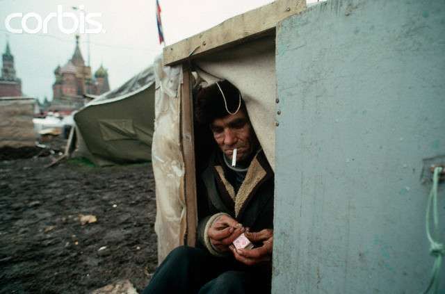Очереди за продуктами - так сейчас нет очередей, но не каждый может себе позволить то мяско, что на рынке продавалось и продается... А помотреть что сейчас делается в глубинке России - по деревням да ПГТ, так лучше эти фото и невыкладывать. Повально спившаяся нация.. Вот на фото - стоят интеллигентные мужички с бидончиками в руках, мирно беседуют, на лице НЕТ недовольства окружающей действительностью. Эх, СССР..