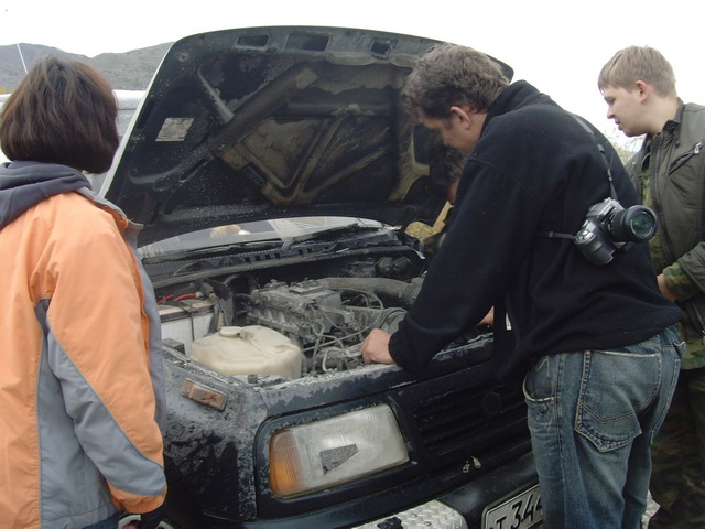 Быстро включаю компьютер и в ванну.В такую рань горячая вода появится в кране не скоро. Пока одеваюсь, краем глаза читаю последние сообщения - не я одна такая, кто-то то тоже желает всем Доброго утра "-еще даже солнышка нет и птички не поют... маньяки.." " - и как вы встали в такую рань..., точно маньяки" вот и хорошо, уже не скучно день начинается... 6-00. Нужно спуститься на улицу к машине, которая меня забирает. Уже опаздываем на общий сбор, но по пути нужно забрать еще одного члена экипажа. В машине с водителем нас четверо + три велосипеда Город спит. Вокруг еще ночная темнота. На "Меркурии" движняк, все готовы в путь, все ждут только нас. 6-14. Выезжаем. Прибавляя скорость, приближаемся к посту ДПС. Вдруг Резкий разворот на 180` Едем в город. Что случилось? Капитан экипажа оставил права в городе. Ничего, сейчас заберем и нагоним... Утро становится все интереснее. Город... 13км... Снежный... Сокол... Палатка... ДПС-таможня... А вот и знак "Карамкен" и наша надпись на дороге "М49 2010г." Это мы ее оставили месяц назад после покорения Карамкенской гряды и водружения на ней наших флагов. Мой голос пробуждает дремлющих попутчиков: "Это мы,.. это наши,.. а вон там флаги! Их виднооо!!!" Далее следует короткий рассказ о восхождении, о том какие мы молодцы Далее перевал и знак "о. Гранд->". капитан экипажа проезжает прямо и невозмутимо продолжает движение. Километр, два... - Капитан, а мы куда? Капитан не перестает нас удивлять - останавливаемся у придорожного кафе "Привал". "Капитан, привал у нас немного раньше, километров на пять, и в сторону,"- хочется кричать мне, но я держусь, так как капитан в экипаже старший и знает, что делает. ВПЕРЕД! точнее назад и уходим в поворот на Гранд. Теперь уже чуть-чуть и я увижу НАШИХ Дорога уходит все дальше и дальше, НАШИХ машин не вижу и впадаю в легкую панику: может мы их проехали, может они нас не дождались и уже рванули покорять очередную вершину-цель?!! А я? Я тоже хочу, подождите меня! Капитан спокоен, как всегда, разворачивает машину и мы на обратном пути обследуем каждый поворот, каждый спуск к озеру. Машин не вижу и паника нарастает еще больше, как вдруг, очень неожиданно обнаруживаем прямо на дороге так долго разыскиваемую колонну. Колонна расположилась у "качелей". Но в колонне тоже паника, потерялся экипаж. Точнее не потерялся, он выходит на связь по рации, и едет где-то сзади. Но сзади его нет... Поэтому логично предположить, что он СПЕРЕДИ! Что и оказалось в последствии. Просто Представление о расстоянии у всех людей оказывается разное, что подтверждает теорию относительности...(не будем углубляться в дебри высших наук) Экипаж Ветра по дороге вытаскивает застрявшую Ниву Все в сборе, все готовы к очередным подвигам... Подвиги на сегодня запланированы следующие: - покорить очередную вершину сопки на о. Гранд и водрузить там флаг М49; - Привести в порядок территорию от скопившегося мусора после нерадивых отдыхающих; - поздравить именинников недели - ТИГРУ и SoLЯRУ ; - хорошо провести время в дружной компании... Продолжение следует... -------------------- Если я промолчала, это не значит, что мне нечего сказать. (с)