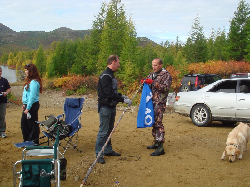 Так вот если обстрагироваться от наметок на будущие походы и вернуться к нашему,то... на рассвете банда М49 была готова к штурму. Некоторые радостно улыбались,кое-кто сонно щурился от вспышек фоторужья. СауроН хвастался,что взял большое ведро под шишечки Остальные с завистью теребили в руках маленькие рюкзачки. Ехали весело. Мы слушали рассказы бывалого Ворона,про его походы на Кони,про систему выживания в дикой природе. Искренне понимая,что сами бы так не смогли.Мимо проносились пейзажи гор,на которых мы еще не были. На одной из остановок Олеся (Микроджип)призналась,что она ужасно боится трассы,т.к. впервые едет так далеко сама за рулем. Хотя боятся причин не было, потому что мы( взрослые джипы )всегда держали ее в поле зрения.Так еще с ней ехал надежный KAMAZ,он же штурман,он же автомеханник,он же Радик. ( присмотритесь -он раздувает флаг на заднем фоне). Он как дунул,только по рации было слышно:"Ну вы где?Я вас догнать не могу....Я тут на ручье,ниву достаю.Здесь недалеко ...километра два от сворота " Экипаж Dark ski" вернулся его искать, по нашим приборам мы 6 км прошли . Выяснилось, что Ветер пронесся вперед всех..!,аж до реки (в его понимании-ручей),не заметив(!) озера. Естественно,когда блудный сын племени,вернулся в лоно семьи,то его все дружно встретили криками:"Ветер-Ветер,ты могуч! Вот ты гонишь... " ВНИМАНИЕ!!! Отсюда на форуме вводится новая единица измерения 2 км=1 ветру Все запомнили? Вот только страшно Ветра выпускать в участники "Хозяина тайги".Нам что его потом по всей Магаданской области искать? Он же не остановится . Разбили лагерь возле качель. Красиво,места много,озеро видно,но неприятно что было много мусора от прежних отдыхающих Мне было стыдно,что двигаюсь медленно. Но что приятно удивило,что рядом постоянно был GOLLANDEC ,andy ,Sergo и Dark ski.Сережа мне заботливо вручил ЕДИНСТВЕННЫЙ посох!"Чтобы тебе полегче было" А когда на пол пути надо было уже включать четыре вд,почему то пытались его отобрать.И хитро смотрели на меня. Выяснилось,что я тащила наверх древко для знамени.То-то они не на шаг не отходили от меня..Боялись,что я его брошу. Как начала бросать с себя одежду по мере восхождения. GOLLANDEC даже забеспокоился,в чем останусь ближе к вершине.Розыгрыш удался у парней,хотя надо было их этим дрыном погонять по склону. Изредко докладывали в лагерь,что слабое звено,то есть я медленно но верно ползет вверх. На пол пути увидела,что все заинтересованно скопились на приступке.Там было что-то вроде могилки. Тут пришли на ум воспоминания,как СауроН обещал ползти и ставить крестики,да слова Баварии,после "Горного озера" что "если она заикнется о восхождении -пристрелите ".Огляделась..Ой,а Баварии нет нигде.У "черепашки-тигры" прибавилось прыти.Прям второе дыхание.Жить то хотелось, тем более на Карамкене тоже молила,чтоб меня пристрелили,если еще раз полезу в гору. Ребята и девчата! И ведь дошла приобщей поддержке. Спасибо,дорогие мои! Наверху уже светились от счастья и переполняемых эмоций Nataisha и SoLЯRA. Так как от подъема лица у нашей светящейся троицы были красные,то вождь племени Dark ski дал команду:" Ну что племя краснокожих,пойдем слово из трех букв выкладывать?" От этого наши лица покраснели еще больше Спуск был потрясный.Ветер весело травил байки,лабрадор Чапа отказывалась идти.Тигра уговарила Чапу :"Ну давай детка не бойся,еще чуть-чуть" Потом Ветер уговаривал Тиг