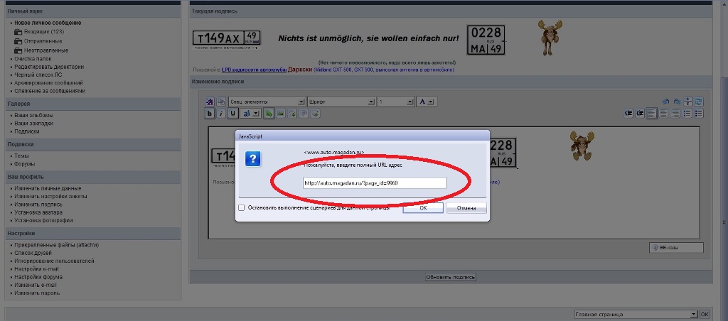 Набираем в нижнем окне текст выделяем необходимый и нажимаем на стрелку "Вставить гиперссылку" (рис.2) В открывшемся окне вписываем адрес страницы нажимаем и ОК (рис.3) Нажимаем "Обновить подпись" (рис. 4) -------------------- ![]() Жизнь-это просто куча всякой фигни, которая происходит. (Гомер Симпсон) ![]() Позывной в LPD радиосети автоклуба: ДаркСкай (Midland GXT900, Midland GXT500 антенна G-flex и выносная в авто) |