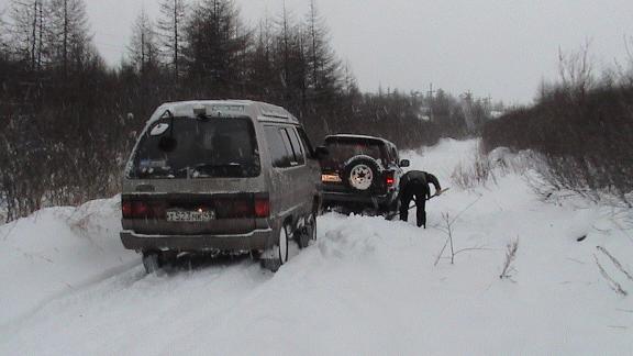 В-общем в 2 "стоковых" машины добрались до середины первого крутого подъёма. Камни все под снегом, рыхлого снега немного, под ним "твердь земная". Проблема: чуть шлифанул - ледок и стаскивает. Я шёл первым, за мной motk на "басике". В итоге меня стащило вправо, и дальше решили уже не пробиваться. Вытащились, и стали спускаться. Наверх ушли ребята на "снежиках" (4-6 шт.). На обратном спуске "подцепили" "Волгу" ( blink.gif ). Когда выбрались на дорогу к карьеру спустились снегоходы. Рассказали, что чуть выше, докуда поднялись - перемёты. Ну и снега, вроде как, подвалило...