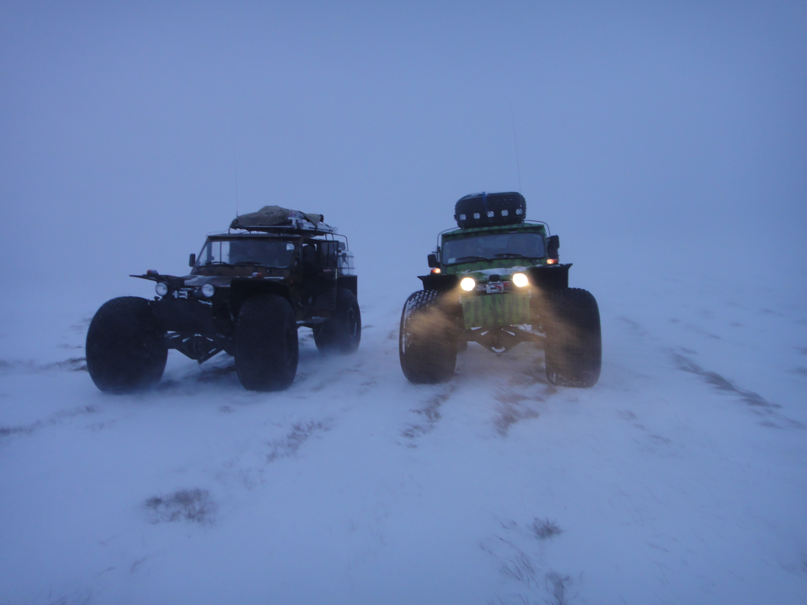 И так. Цель нашей поездки - как можно дальше проехать в сторону бухты Мелководная. Мы стартуем 3-го января, "Норд-трофи" (дальше НТ) - 4-го. Для начала о выборе маршрута. Из-за аномальной погоды декабря - Ольский лиман, по которому мы всегда срезаем путь, не замерз. По-этому необходимо было выбрать маршрут, который избегает проезда по льду данной водной преграды. После тщательного изучения снимков Гугла и карт местности - нашел объезд. Вторая наша проблема - перевал от Ольских полей до подножия Атаргана. Крутой спуск с перевала жуткий даже летом, зимой там делать вообще нечего, так что его необходимо было так же объезжать. Подобрал дорогу, которую постоянно видел с этого спуска, но никогда там не был. Где выезд на данную дорогу - только догадывался. 3-го января из Магадана выезжает наша колонна. В основном это Эскудики - Делегат, Мик, ЮВС. Наш всеми обожаемый "Синий Паджеро" (во всех смыслах), Сафари с Дж... Тимуром, Делика (наш новичок в поездках) и мы с Пашей ZZZ на Паджеро (вроде никого не забыл). По дороге на Олу понимаем, что погода совсем не шутит. Мощная метель не давала обзора даже на 50 метров. На дороге - переметы. Доползли до Олы, выехали за котельную и решили спустить колеса. Как оказалось - рано. Дорога от котельной до Лимана абсолютно чистая, только пара переметов. На Лимане по краю льда выскочили на Ольские поля и по снегоходных следам выехали на какую-то дорогу. Вроде наша. Поехали? Поехали. Тут и началось веселье. Езда по снегоходному путику - не самое веселое занятие. начали подсаживаться. В итоге - к обеду мы кое-как смогли победить небольшой подъем. За ним "Синий Паджеро" порвал полуось. Делика, ЮВС и Паджеро повернули назад. Мы остались в 4 машины и попытались ехать дальше. Впереди нас ждал веселый подъем с кучей снега. На этот момент мы уже поняли, что едем не туда.... Развернулись. По натоптанной колее выскочили на выдутые ольские поля, где метель приняла ещё более грозный вид. Тимур решил возвращаться домой. Попрощались с ним и продолжили путь. В полной темноте (уже солнце село) и жуткой метели почти сразу нашли следы "Хищников", по которым вышли через поле на ручей (дорога на слияние Ланковой и Белой). На съезде в ручей - 1.5 метровый перемет (в высоту). На преодоление перемета ушло не меньше часа. Делегата умудрились оставить в самом начала спуска, для его вызволения пришлось разворачивать Паджеро (ещё то веселье) и наращивать трос для лебедки. Связали все что было. Дальше начался лес, в котором снег не выдувало. Встретили "Хищников", которые уже возвращались. "Да вы легко проскочите" - сказали они. Ага, легко. Насмешил... Но ветер присутсовал хороший. Все это было приправлено хорошим морозом. Напялил на голову маску. На ветру она превращаласьв кусок льда прямо на глазах. Снять в машине сразу и не получалось. Обмерзали ресницы, брови. Макска примерзала к щетине на лице. Когда запрыгивал обратно в машину - все это начинало таять. По началу не мог понять, откуда идет дождь. Начался настоящий экстрим. Мы били дорогу, а Мику пришлось тащить Эскудо Делегата, который, будучи почти в "стандарте" не смог ехать по свежей колее. Поздним вечером остановились и разбили лагерь. Попытались разжечь костер. Дурная затея - ветер играл свою роль и раздувал пламя на 1.5 метра, но все равно замороженное дерево не хотело гореть. Пришлось греть еду на газовой плитке. Короткий ужин и о