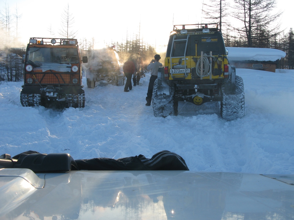 Почти все 3-е января мы потратили на битву на "левую" дорогу....которую в итоге добили Норд-трофи и вырвались на скотобойню. Вечером 3-его мы вернулись на дорогу на Чистое (нижняя), на ту, по которой на слияние Ланковой и Белой ездим. Нас оставалось 3-е. За первую половину 4-го января продвинулись всего километра на 3. Там началась эпопея. Miky и Delegaty надо было домой. Мы начали разворачиваться, чтобы их проводить. тут и встретили AlEXa, через 15 минут появился "Лось" с Дюймом и ЮВСом в кабине. На прицепе снегоход. Позже подтянулась остальная НТ банда (Рыбакоп, Руслан, Ежи). Pawell занял место на снегоходе, Рыбакоп отозвался на просьбу сопроводить наших товарищей до Ольского Лимана. Пока НТ разгружали снегоход - мы разворачивали на колее Паджеро ZZZ и Эскудо ALEXa. Ещё та затейка... Подождали, пока НТ начнут движение и дернули за ними. Эскудо не пошел по снегу... В итоге мы зацепили его и вот так на буксире дотащили до полей перед Чистым. Там плутали по следам. В итоге заехали в лес за Чистым. До НУПа, где должны были ночевать НТ совсем чуть-чуть должно было оставаться. А у ребят на Эскудо оказалась проблема с запасом бензина. В итоге мы на одной машине доехали (ещё плутали по лесу) до НУПа аж в 4 ночи... последние 2 км - на лебедке. Мороз около 35 градусов. Жутики. Хотели разжиться бензином у НТ. Не получилось. В итоге там заночевали и утром в обратку. В обратку часа за 3 и доехали до Олы (по пути не забыли опять заблудиться). НТ поехали дальше бить дорогу. Сейчас по дороге (по крайней мере до НУПа) на 33-х можно легко добраться. Утоптали замечательно.А если не сможешь- то можете себе в голову гвоздь забить.... Водитель вы никудышный -------------------- 89148508740