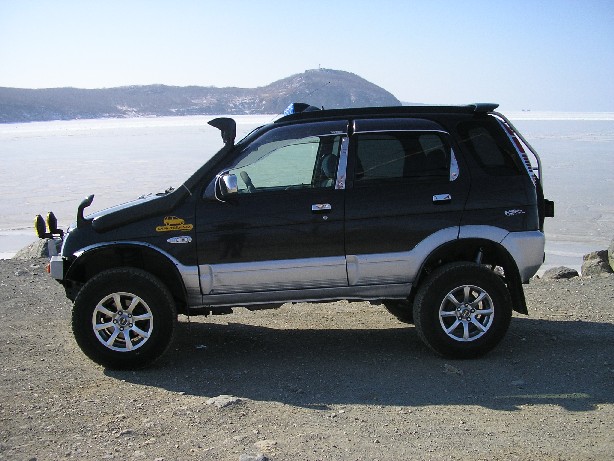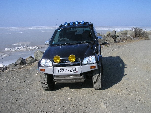 - 1997 г.в., - двигатель HC-EJ, 92 л.с., - 4 WD, автомат, блокировка межосевого диференциала - лифт подвески около 3.5" (около 8-9 см.), встают колеса 215/85/15, что дает прибавку в 4 см. к существующему клиренсу (дорожный просвет) 19.5 см., итого 23.5 см., спереди проставки в штатных стойках, которые переделаны в разборные и обслуживаемые, 30 мм., сзади усиленные и удлиненные на 10 см. пружины, а амортизаторы - усиленные, серебристые KYB 553230 (от Ниссан Террано) - литье с небольшим вылетом "наружу" (штатный +38 см., стоит +18 см.), что дает повышение устойчивости поднятой машине - расширители колесных арок (дополнительные фендера) - хром по кругу (накладки на "ушах", на дверных ручках, на стопарях, на дверных стойках, повторители поворотов в крыльях) - фары под хрусталь - усиленный аллюминиевый передний бампер 6 мм. с "подиумом" под туманки - защита картера, автомата и раздатки снизу из рифленного аллюминия 3 мм. - шнорхель (наружный воздухозаборник) - "люстра" дополнительного освещения (4 фары) на крыше - сапуны моста, раздатки и двигателя выведены в специальную емкость в верхней части моторного отсека, под крышкой капота - лестница на задней двери - спойлер с повторителем стоп-сигнала - фонари заднего хода переставлены с бампера на спойлер (под ним) - накладки на порогах (под дверями) -------------------- |