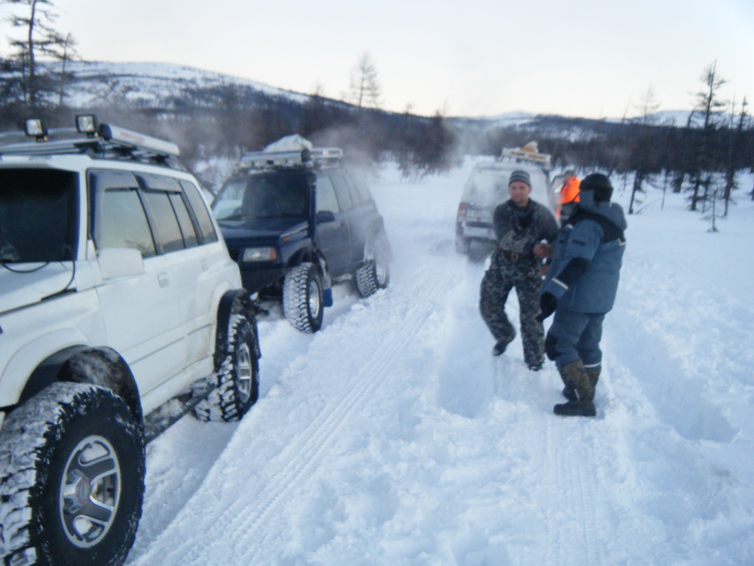 Несколько машин ушли. Среди них и "безумный эскудик". Обратно планируют прибыть в воскресенье. По дороге встретились эти ребята. Если в следующий раз не поменяют на своей машине "дохлые" аккумы - возвращение домой под вопросом. Лебедка всю зарядку с аккумов высосала и двигатель заглох. Хорошо на улице около -18 было. Пару раз снимали аккумы чтобы их завести. Ну а мы по причине убитой дороги и сломанной лебедки развернулись и уехали домой. |