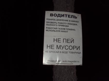 Уехали мы на Мелководную 10.02.11 в 21.00 с Дукчи двумя машинами - паджерик на 35 резине с лебедкой и сурф - почти стандарт, без лебедки. Пилоты мужчины, штурманы женщины. Доехали до Мелководной за 4 часа. Дорога НОРМАЛЬНАЯ!!! Была одна засада при разъезде с обратно-возвращающимися двумя крузаками. Наш сурф съехал на обочину и засел. Пришлось выдергивать его веревкой. Это было после лимана. Далее еще встречали два раза по три встречных машин - разъезжались без проблем в местах накатанного разъезда (без веревок, лебедок, лопат и матов). По пути немного не доезжая до НУПа перед первым перевалом встретили делику с сурфом. Они выехали с Олы в 20.00, чё-то там копались, но нас пропустили. Повторюсь дорога была НОРМАЛЬНАЯ!!! По дороге наткнулись в трех местах на информационные таблички. Спасибо тем, кто их придумал, сделал и развесил!!!!! НО!!! Нашим некоторым людям такие таблички надо на лоб прибивать! Т.к. они не понимают вобще ничего, кидают мусор, бухают по-дороге мешая остальным ехать (такие попались нам на обратном пути). Доехав до бухты, поужинали, переночевали и в 8 утра следующего дня поехали рыбачить. На льду было машин 50. Среди них был даже вобще полный стандарт эскудик. К нам подъехали ребята на прадике-механике, которые выехали в одну машину в четверг позже нас. Я их подписала "рыбаки". Позитивные товарищи. Обратно возвращались в субботу в 19.00 уже тремя машинами (мы, сурф и прадик). Дорога была опять НОРМАЛЬНАЯ!!! про лебедку вобще забыли, т.к. она нам не понадобилась. Были следы от вездехода, в основном рядом от дороги, калею он не испортил, а от ГАЗ 66 вобще следов видно не было. Доехали обратно за 5 часов. Затрудняли проезд два пьяные в кал дедушки на прадике. Они валились каждые сто метров. Но они пропустили нас на НУПе, оставшись там добухивать. Отдохнули мы за эти два дня на ура... Погода не очень обрадовала - был ветер и пасмурно, поэтому рыба ловилась не очень активно. Но в целом впечатления и воспоминания остались хорошие от отдыха, поездки и компании.