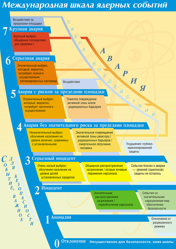 Международная шкала ядерных событий (англ. INES, сокр. International Nuclear Event Scale) разработана Международным агентством по атомной энергии в 1988 году и с 1990 года использовалась в целях единообразия оценки чрезвычайных случаев, связанных с аварийными радиационными выбросами в окружающую среду на атомных станциях, а позднее стала применяться ко всем установкам, связанным с гражданской атомной промышленностью. МАГАТЭ рекомендует оповещать страны-участники в 24-часовой срок о всех авариях выше 2 уровня опасности, когда имеются хотя бы незначительные выбросы радиации за пределы производственой площадки, а также в случаях событий 0 и 1 уровней, если того требует общественный интерес за пределами страны, в которой они произошли. Такой подход позволяет оперативно и согласованно оповещать общественность о значимости с точки зрения безопасности событий на ядерных установках, о которых поступают сообщения. Информация передаётся в СМИ странами-участниками и самим МАГАТЭ, в том числе посредством интернета.