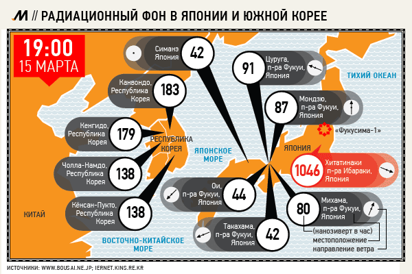 данные о текущем радиационном фоне и направлении ветра прямо со станций слежения, расположенных вокруг главных атомных электростанций японии