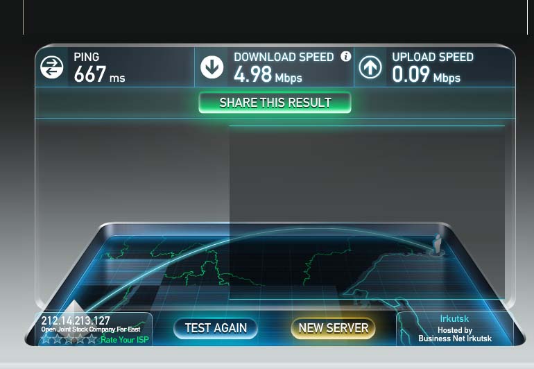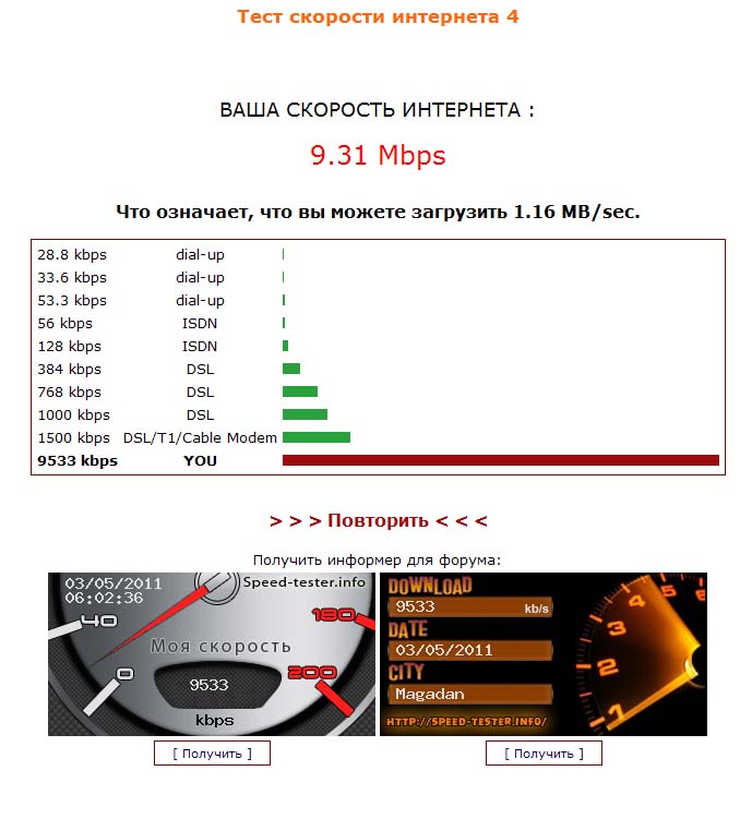 дык лучше проверенным инструментом - speedtest.net Что-то инструмент не открывается вообще. Вообще такая фигня началась примерно недельку назад. До этого было до мегабита, максимум полтора и то глубокой ночью. А с конца апреля попёрла такая странность. Хотя идёт скачками, в основном всё те же самые полтора мегабита. |