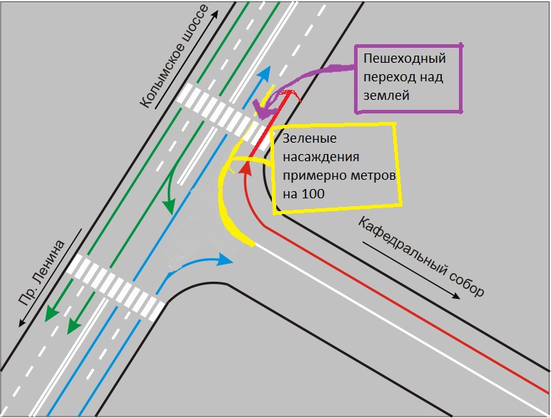 Данная тема предназначена для обсуждения указанного в названии темы перкрестка! Вопрос касается только организации дорожного движения на заданном участке дороги. Все неподходящее под проблематику темы будет удаляться без предупреждения. Не раз уже слышал от форумчан предложения по организации полосы разгона на перкстке ул. Ленина и объездной дороги ведущей от кольцевой развязки за Кафедральным Собором. Проблема там действительно имеется и пробки там значительны особенны в час-пик. Колонна растягивается до самого моста через Набережную. Но на самом деле в чем там проблема? В первую очередь проблема заключается в том, что магаданкие водители не умеют ездить по полосам и проблема заключается не в дороге, а в головах водителей! И именно с ней необходимо бороться. Но все же сам по себе перекресток имеет право быть реконструированным хотя бы затем, чтобы транспортный поток двигался без остановок. Безостановочное движение автомобилей в потоке позволяет увеличить пропускную способность улиц, уменьшить аварийность, улучшить экологию, снизить расход топлива. От вас жду вашего мнения по работе над данным перекрестком, идей и мнения. 1. Реальная ситуация В реале у нас одна полоса для поворота направо, поворот налево запрещен (и правильно). Но тут вступает иная проблема - даже если по ул. Ленина в сторону 31-го транспорт движется только по левой полосе - народ все равно боится выезжать... 2. Две полосы направо В больших городах часто встречающаяся практика, когда с двух полос одновременно разрешен поворот, при этом авто с правой полосы при повороте занимает ту же правую полосу, а с левой - левую. Это позволит увеличить скорость потока, но в таком случае правой полосе будет затруднен обзор на ул. Ленина, нерадивые водилы будут резать параллельный поток... ну не умеют наши водители двигаться в плотном потоке. 3. Полоса разгона Наиболее оптимальный вариант, который позволит не тормозить вообще, а, разгоняясь, вливаться в общий поток. Но реализация данного перекрестка возможна в полной мере только с условием адекватности водителей. Даже в случае успешного строительства полосы разгона - биться будут особенно первое время. Но я замолкаю пока и жду ваших мнений. Голосование прикреплю позже, когда большинство уже выскажется -------------------- 89148508740