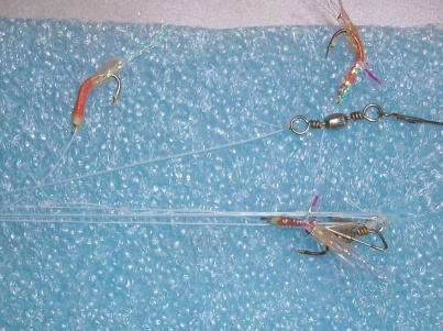 ...селедку я ловил на обыкновенные зимние корюшковые самодуры, обнаружил один момент: крючков больше 5шт. не надо... когда поймались 4 селедки, подумал, что сломаю удочку (тест прошла!), еще один момент: т.к. глубина (военный пирс) устанавливается около 4-х метров, то поплавок сделал скользящим, со стопорным узлом, для удобства заброса.