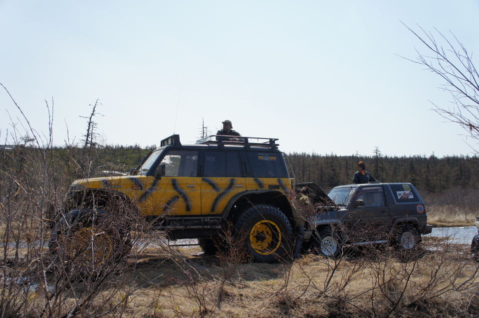 С Дельфином вообще ситуация комичная... мы в 2 машины на обратном пути поехали чинить "Ниву", пока чинили - где-то правее нас рокотал мотор и сигналили.... мы даже не смогли сразу заметить Паджерик закумуфлированный кучей грязи, который был от нас метрах в 300х. Мы шли по лесу спокойненько, а он - по полю, в итоге там и присел. Подъехали, вытащили. И вместо того чтобы поехать за нами - он снова ломанулся по полю. Ну как хочешь?