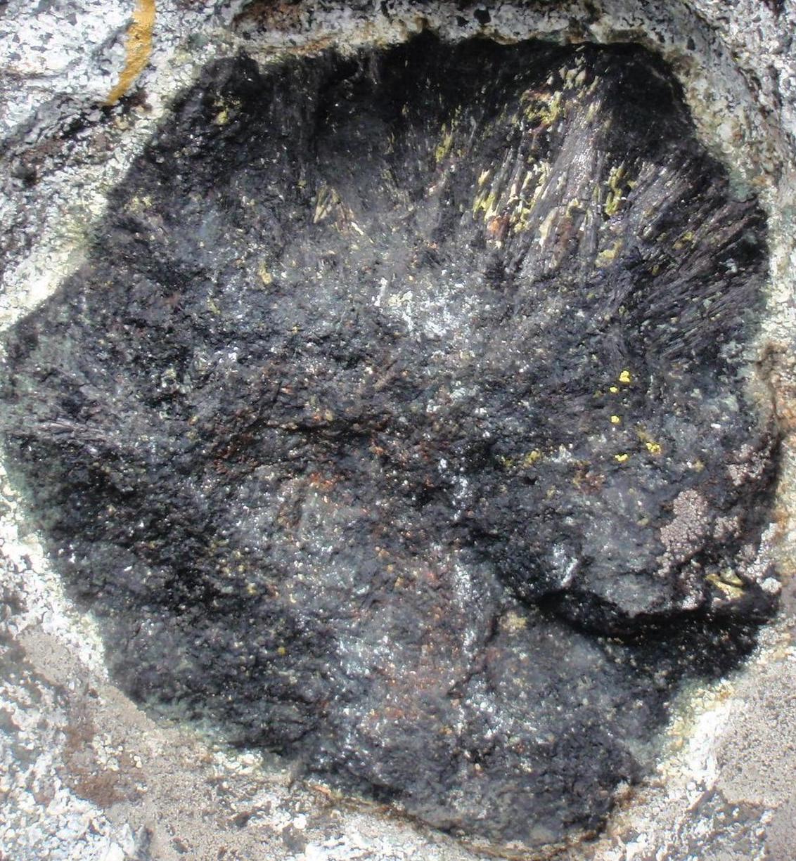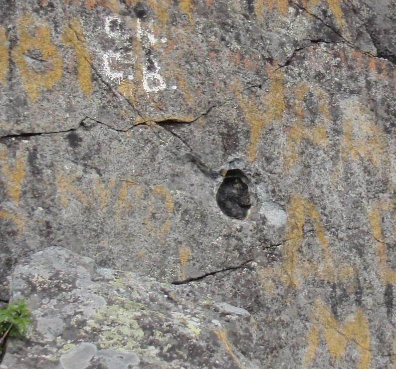 Может молния попала? Молния бьёт в верхнюю точку. Здесь же вплавленный шароообразный объект в практически отвесной скале. В диаметре примерно 15-20 см, что просто много для молнии. От эпицентра удара расходятся трещины. В серой скальной массе серого цвета камень чёрного цвета совершенно другой структуры и прочности - я не смог отбить ни кусочка, все остальные камни просто крошились. Видимо, раскалённый в атмосфере метеорит просто вплавился в скалу, по краям видна "сварка" двух разноструктурных пород. То есть температура была намного выше, чем просто расплавленная магма. Где либо отсутствуют разливы чёрной массы, лишь в одном месте, метрах в 3-4 обнаружил небольшую выемку со скруглённым дном и чёрными частицами, схожими по структуре с шарообразным объектом. Сообщение отредактировал Murlokotam - 19.6.2011, 2:30 |