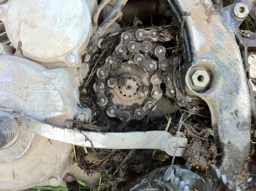 В общем дело было вечером, решили мы с романом (рэйд) устроить променад. Катнули по привычному маршруту старая-горняк. На горняке было решено попробовать доехать до дукчи что и было сделано без особых проблем, не считая того что роману захотелось "погладить" шлемом проезжавший мимо уазик )))) Затем Решили катнуть с малой стеллы с основной трассы, через поля на объездную. Поехали. Помня что в прошлый раз заплутали и выехали на самой дукче было принято решение забрать влево у полей где дорога вверх пошла. Завернули. Выехали под стойки ЛЭП, поехали вдоль них и выехали на чудесненькое такое поле... вдали виднелась неширокая лесополоса, которая шла вдоль объездной( как мы решили smile.gif Было принято решение ехать не через поле, ибо было подозрение что там ср№нь аццкая, а вдоль лесочка с которого мы выехали. Спустя 20 метров я понял что такой принцип формирования маршрут нам не помог. Густая трава по седло, и очень неприятная чача-ча вперемешку с ОЧЕНЬ непредсказуемо неровной землей, на которой встречались пеньки (которые собсна были скрыты травойsmile.gif все это делало наше продвижение оч знаете ли неприятным. Ну про стаи комаров я молчу. И тут случилось ТЫЩЬ! В очередной "застревалке" по ось заднего колеса у меня наконец то слетела моя вечно провисающая цепь (которая кстати при выезде была в очередной раз подтянута!). Смотрю я значит на нее и удивляюсь- как это она так слетела, а я ее даже вытянуть не могу! Вопрос разрешило сняти погнутой защиты передней звезды путем выкручивание погнутых болтов ))) см фото. Минут 20 я проковырял цепь в попытке извлечь ее из плена обстоятельств прежде чем мне пришла идея снять звезду! Что и было произведено после чего цепь благополучно была натянута. А знаете ли не оч то и просто это все делать в обстановке наполовину по боты в хлюпающей хрене, в шлеме и потеющей маске (снимать их был не вариант, вокруг нас толпы комаров света Божьего не пропопускали). В общем мою проблему решили. Но оказалось что втух не я один... почти в то же время и месте где у меня слетела цепура, роман окончательно сжег сцепление (по нашим предварительным предположеиямsmile.gif)) что обернулось несением его на себе обратно к спуску от стоек ЛЭПа, и вызовом товарища на машине, который и прицепил бедного рэйда на трос. А по болоту был произведен эксперимент по буксированию мотака проводами для прикуривания ))) Во время всего этого действа была окончательно потеряна болтающаяся задняя поворотка, порван тросик "антиугонки" на заднем крыле и размочалены провода прикуривателя smile.gif)