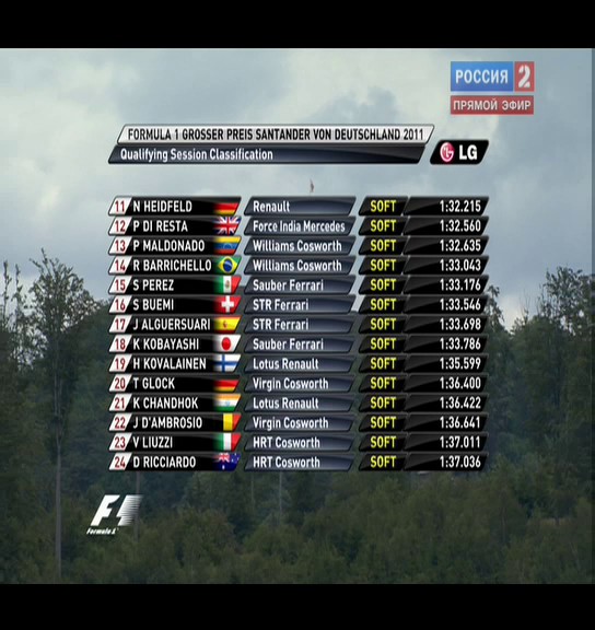 Pos No Driver Team Time/Retired Gap Laps 1 1 Sebastian Vettel RBR-Renault 1:30.916 15 2 2 Mark Webber RBR-Renault 1:31.049 0.133 16 3 5 Fernando Alonso Ferrari 1:31.138 0.222 12 4 3 Lewis Hamilton McLaren-Mercedes 1:31.578 0.662 13 5 4 Jenson Button McLaren-Mercedes 1:31.623 0.707 14 6 8 Nico Rosberg Mercedes 1:31.694 0.778 19 7 6 Felipe Massa Ferrari 1:32.144 1.228 13 8 14 Adrian Sutil Force India-Mercedes 1:32.391 1.475 20 9 7 Michael Schumacher Mercedes 1:32.523 1.607 16 10 12 Pastor Maldonado Williams-Cosworth 1:32.751 1.835 18 11 10 Vitaly Petrov Renault 1:32.777 1.861 18 12 15 Paul di Resta Force India-Mercedes 1:32.813 1.897 21 13 9 Nick Heidfeld Renault 1:33.072 2.156 18 14 11 Rubens Barrichello Williams-Cosworth 1:33.179 2.263 17 15 17 Sergio Perez Sauber-Ferrari 1:33.531 2.615 20 16 16 Kamui Kobayashi Sauber-Ferrari 1:33.671 2.755 20 17 18 Sebastien Buemi STR-Ferrari 1:33.948 3.032 21 18 19 Jaime Alguersuari STR-Ferrari 1:34.125 3.209 19 19 20 Heikki Kovalainen Lotus-Renault 1:35.385 4.469 13 20 24 Timo Glock Virgin-Cosworth 1:36.724 5.808 21 21 23 Vitantonio Liuzzi HRT-Cosworth 1:36.804 5.888 23 22 25 Jerome d'Ambrosio Virgin-Cosworth 1:36.894 5.978 23 23 21 Karun Chandhok Lotus-Renault 1:36.959 6.043 18 24 22 Daniel Ricciardo HRT-Cosworth 1:37.554 6.638 22 -------------------- (964) 459-792-девять Дмитрий, адвокат
