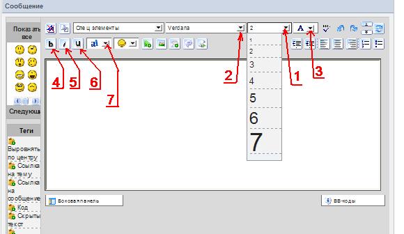 P.P.S. Может быть, кто-нибудь научит меня справляться с размером шрифта? Изменение размера шрифта производится посредством непосредственного клика левой кнопки мыши на выпадающее меню в окошке отправки сообщения обозначенного на рисунке номером 1, и выбором желаемого шрифта. Выпадающее меню за номером 2 позволяет изменить стиль шрифта. Меню за номером 3 - изменить цвет текста. Меню 4 - откармливает жир-р-рный шрифт. Меню 5 - перекособочивает буковки в правую сторону. Меню 6 - подчёркивает позволяет писать подчёркнутым текстом. Меню 7 помогает найти строку, позволяющюю написать перечёркнутые ругательства и заведомые глупости. Также можно выделить правой кнопкой мыши любую часть текста, и воспользовавшись или даже злоупотребив одним из вышеозначенных меню придать выделенной части текста желаемый вид. Смалики вставляются с помощью меню в виде ехидной рожицы без инвентарного номера. Сообщение отредактировал Murlokotam - 21.10.2011, 23:10 Спасибо! — LISS