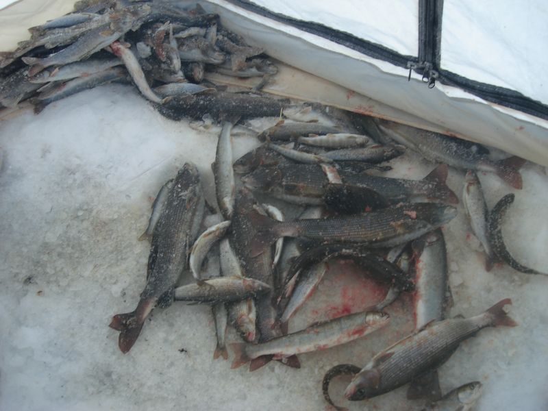 Место лова от п. Клепки, через метео около 40 км. Время в пути 2 часа. Дорога накатана, наледей нет, дорога обходит все опасные места (провал за островом перед «Калюжным» и т.д.). На льду было шесть автомашин. Лёд 40см. Клёв слабый с 12 до 14 часов. Хариус, кунджа на мормышку +иск. красная, жёлтая икра +опарыш. Мороз утром -32, днём -28. Сообщение отредактировал lev 43 - 23.12.2011, 21:15 |