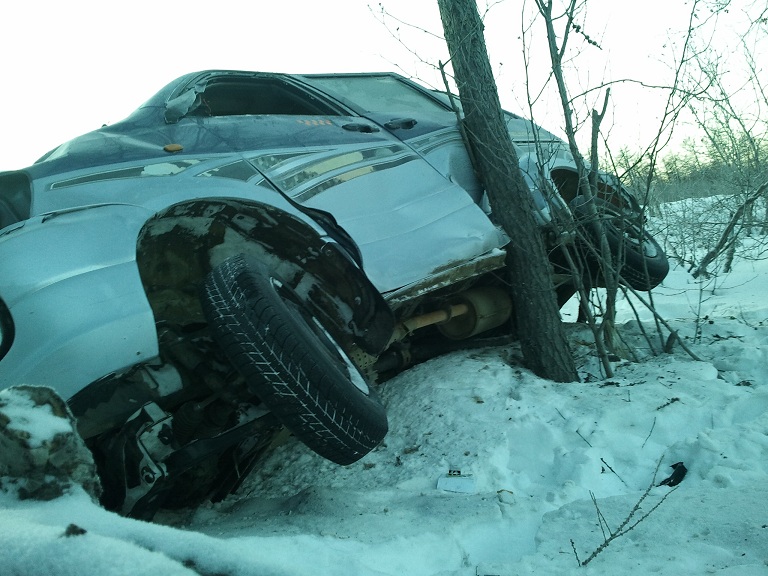 Ещё одна история. Так же 1 января еду в сторону Олы. Первый затяжной подъём. Иду 50-60 ио тут мены начинает резко швырять на встречку, благо никого небыло. Бросаю газ выравниваюсь и станавливаюсь у обочины на встречной полосе. Тронуться немогу шлифует задний привод. Вышел из машины и упал)), свиду асфальт оказался сплошным катком со льдом 2-3см. С горем пополам начал скатываться задом и случайно увидел такое чудо в кустах. В машине никого небыло открыта т.к. окна разлетелись, видно что такси. А вдруг пассажиров вёз и они "того", закопаны в снегу, а сам скрылся. Мож кто подробности знает.
