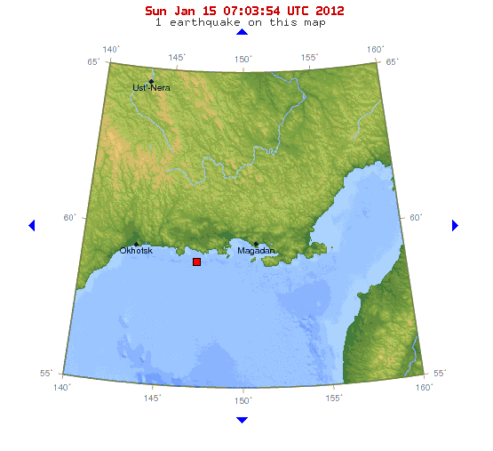 Date-Time Sunday, January 15, 2012 at 06:29:23 UTC Sunday, January 15, 2012 at 05:29:23 PM at epicenter Location 58.766°N, 147.123°E Depth 16.5 km (10.3 miles) Region SEA OF OKHOTSK Distances 228 km (142 miles) WSW (249°) from Magadan, Russia 229 km (142 miles) ESE (106°) from Okhotsk, Russia 2624 km (1631 miles) N (10°) from TOKYO, Japan Location Uncertainty horizontal +/- 18.2 km (11.3 miles); depth +/- 6.3 km (3.9 miles) Parameters NST= 88, Nph= 91, Dmin=912.8 km, Rmss=0.56 sec, Gp= 65°, M-type=body wave magnitude (Mb), Version=6 Source Magnitude: USGS NEIC (WDCS-D) Location: USGS NEIC (WDCS-D) Сообщение отредактировал Форанер - 15.1.2012, 19:09 -------------------- Позывной на LPD 17 канал: "Форанер"