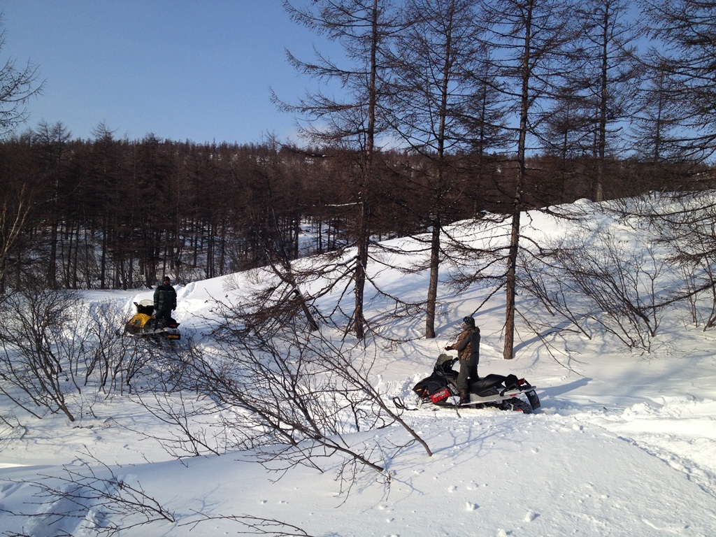 Привязались за левую лыжу и за багажник. Двое на скалах чикерят, один газует, четвёртый за лыжи страхует или за жопу. Местами по воздуху практически, опираясь на кромку. Придумывали всё по ходу. Самая жесть, это наледи по распадкам. 50 м в длину и наклон градусов 30 с обрывом в море. Рубили квадраты через каждые 0,5м. Получалась тропа. Один за рулем, двое в упор с боку, четвертый на веревке в скале чикерит. Самому не верилось, когда по светлому потом туда ездили второй снежик спасать