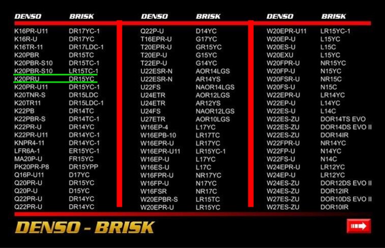 Скачал документ... Объясните его суть. Буквы цифры... Какие подходят к J-20A? находите в мануале на свой авто свои свечи (обычно для японцев это ND(DENSO) NGK) , затем находите напротив японской свечи подобные бриск. проще простого позвонил корефану, говорит на джи20 идут NGK - BKR6E, ND - K20PR-U а значит у бриск это DR15YC, и значит и DR15TCY-1 подойдут и на J20A Сообщение отредактировал dissector - 4.3.2012, 20:28 -------------------- наружная реклама, световые буквы, подсветка зданий