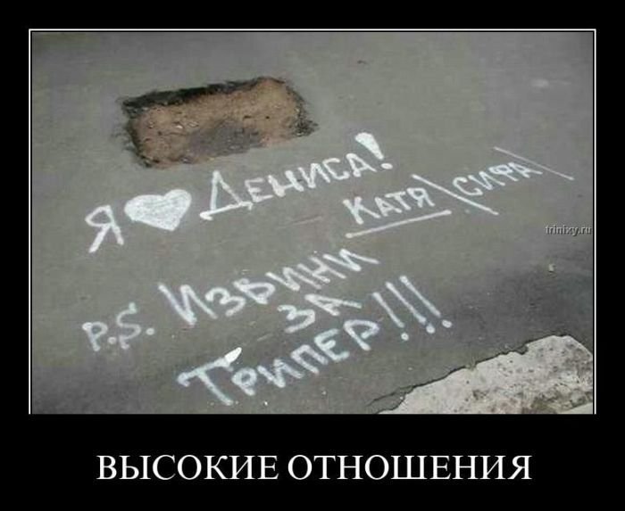 Вчера пришёл Сергей, молча положил в копилку 250 рублей и рассказал, что произошло на его объекте, и чем вызвана задержка в сроках. А мы, пока слушали, добавили туда ещё 100 рублей на комментариях. - Не лезьте в наш любовный треугольник, нас тут и так семеро! - Работники лакокрасочного завода возвращаются домой через сказочный лес. - Девушки порой такие скрытные: "Имя: Екатерина. Фамилия: скрыто. Дата рождения: скрыто. E-mail: ivanova1985@мэйл.ру" Из детских диалогов... - Не задничай! - Вообще-то, это слово на "Ж" начинается! - Вот я тебе и говорю - НЕ ЗОПЬСЯ!!.." -------------------- |