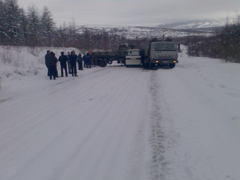 Ольский перевал. Около 12 часов дня. Камаз сложился, хайс не смог оттормозиться. Очень скользкая непосыпанная дорога- лёд, накатанный снег.