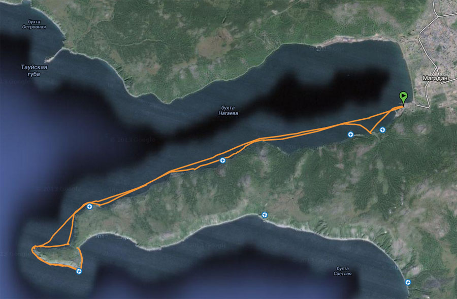 В выходные случайно выбрались на море, 19 километров по джипиэсу намотали. Как-то не догадались сразу пойти в город, но, судя по всему, переход Нюкля - Магадан займет около 4 часов ненапряжной гребли. Лучше всего выходить в малую воду и идти по приливу, тогда и течение и ветер попутные, скорость высокая и можно часть пути матрасить под парусом.