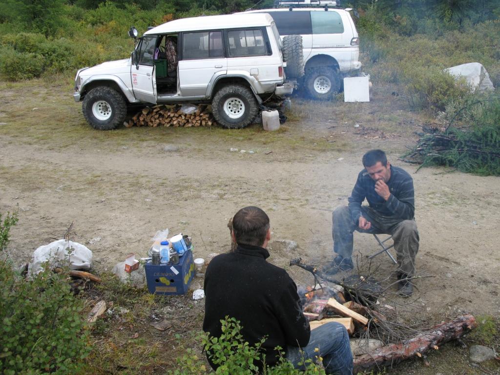 Вот и мы тоже побывали на этом известном озере. Выехали 9-го поздно вечером, на подъезде к Атке по невыясненным причинам намотали радиатор на вентилятор(остановились на версии попадания постороннего предмета между лопастями и радиатором). Утром , у дорожников Атки заглушили десток повреждённых трубок и двинулись дальше. Свернув с трассы к озеру, уперлись в ФС-ки на Дебинском мосту, среди ФС-ок остался небольшой проезд - самый раз для легковушек, им и воспользовались, через пару километров встретили 4-ёх пешеходов идущих от озера, причем из них двое помоложе выглядели бодренько и приветствовали нас жестами, а двое постарше(50-65 лет) всем телом оперевшись на машину на ломанном русском пытались выяснить сколько ещё до трассы, нам пришлось сознаться что им осталось пару км., вздохнув с облегчением и с сожалением отпустив опору ввиде нашего авто, иностранцы продолжили переставлять ноги ближе к трассе. Дальнейший путь был нетруден для наших немного подготовленных машин, но скорость передвижения оставляла желать лучшего, как выяснилось в пути, у Делики оказались полностью нерабочими задние аммортизаторы, что снижало нашу скорость и маня паджерик,сексуально-призывно раскачивало тазобедренный сустав делики. К луже со щитами на объезде мы подъехали в полной темноте и конечно не увидев оного махнули по воде, не ожидая подвоха, паджерик двигался в паре метров от делики не отводя фар от стройной попутчицы, а мадам делика увлекшись сооблазнением, не смогла с первого раза выехать из мутной воды и паджер булькая глушителем, забыв о даме, вверг в панику своих пассажиров расслабленно впуская потоки воды в салон. Но всем повезло, делика все-таки грациозно покачиваясь выбралась на сушу а за ней, отфыркиваясь потоками воды из открытых дверей и паджер выпрыгнул на сушу. Заночевали мы прямо напротив Джека Лондона, возле егерского домика. По утру двинулись к озеру Танцующих Хариусов. На этом отрезке неприятные ощущения создавали только валунистые перекосы дороги. Ближе к обеду показалось и солнце осветив распухнутые пустые авто и нас разбежавшихся с удочками по протоке. Рыбалка была отличной, хариус подвешивался на крючки ко всем кроме меня(так всегда было и я к этому привык). Через пару часов уху уже разливали по мискам в том числе и мою двухведёрную тоже наполнили до краёв(к этому привыкли все остальные). Позже, к нам подошли за куревом местные егеря и за разговорами поступило предложение перекочевать в спортивный лагерь "Боевой", такой бонус был кстати и следующий дождливый день(и не один день) это подтвердил. Последующие дни рыбалка сошла на нет по погодным условиям, и даже поездка на Кюель-Сиен рыбы не прибавила. В промежутки между дождями вода оставалась высокой, рыба не клевала, мы развлекались теннисом, волейболом на верхушке с частыми гонками за мячом вниз по склону, и конечно же мужскими разговорами о рыбалках, поездках, талиях и обо всём сопутствующем. Красоту же озер оценить в полной мере не удалось из-за сырости в воздухе и на одежде, но удовольствия всё-равно было выше крыши. Обратный путь был более тревожный, дожди переменной силы могли сделать речки непроезжабельными а курева и Колы оставалось в обрез. Лужи стали более глубокими, во многих местах по дороге текла встречная вода, дворники паря загибались сталкивая воду со стёкол, но непро