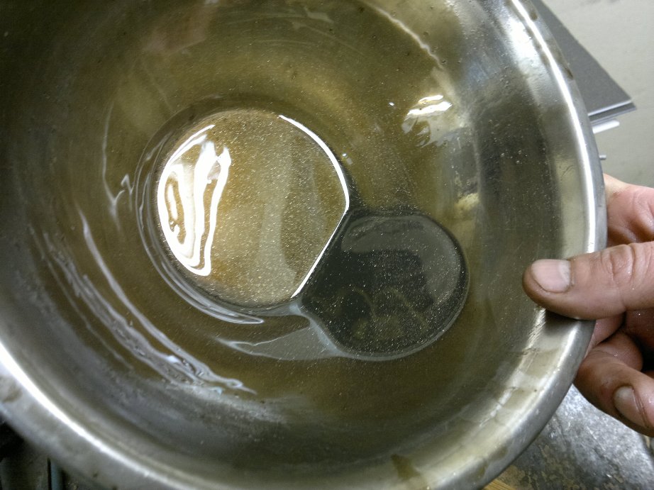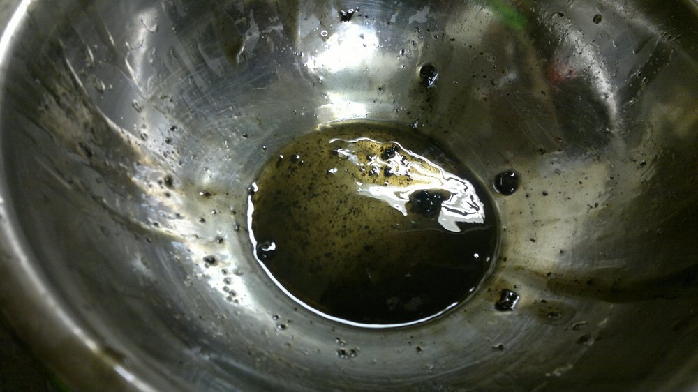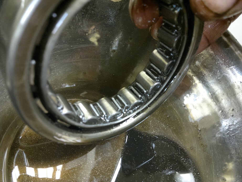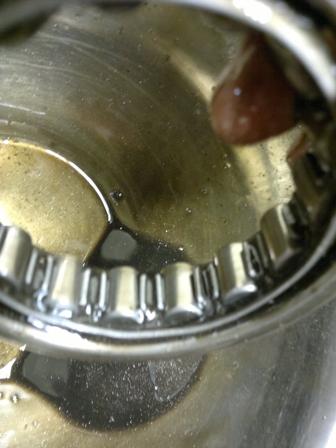вобщем не стал ждать промывки своего двига и принялся за ращеты, так как поступил не совсем правильно с химической промывкой. на этот раз не сложной формулой взял 5в40 4л.масла и 300мл.химии. ращитал на 0.1л.масла 7.5г.химии в стекляной таре видно что масло по краснело(химия красного цвета) тщательно перемешал,нагрел до 75градусов (не открытым огнем) взял потшипник тоже в сале,пыли, вобщем засратый=) положил в чашу и залил. сразу после заливки стал его интенсивно перемещать по дну чаши круговыми движениями ,потом достал и взявшись за наружную обойму начал прокручивать внутринею обойму,сначало туго было,потом по легче а в скоре вообще пошло все очень даже весело. в конце погрузил борт потшипника в чашу и продолжил вращение. вобщем процесс длился около 6-7мин. результат на фото. многочисленная грязь,сало,пылюка просто ращепились и превратились в жижу без грубого(кускового) осадка. тоесть ращипило и растворило всю срань. даже стружка из под роликов повылетала. ну вобщем как то так. думаю что масло-щелочные промывки не смогут проникнуть в саму структуру налета,так сказать не смогут ращипить сетку,они только снимут то что было поверхностно.(это мое мнение) вобщем я доволен опытом