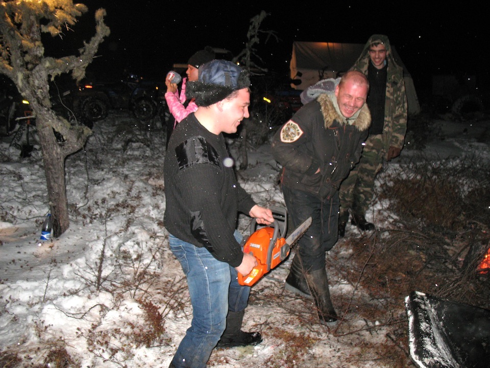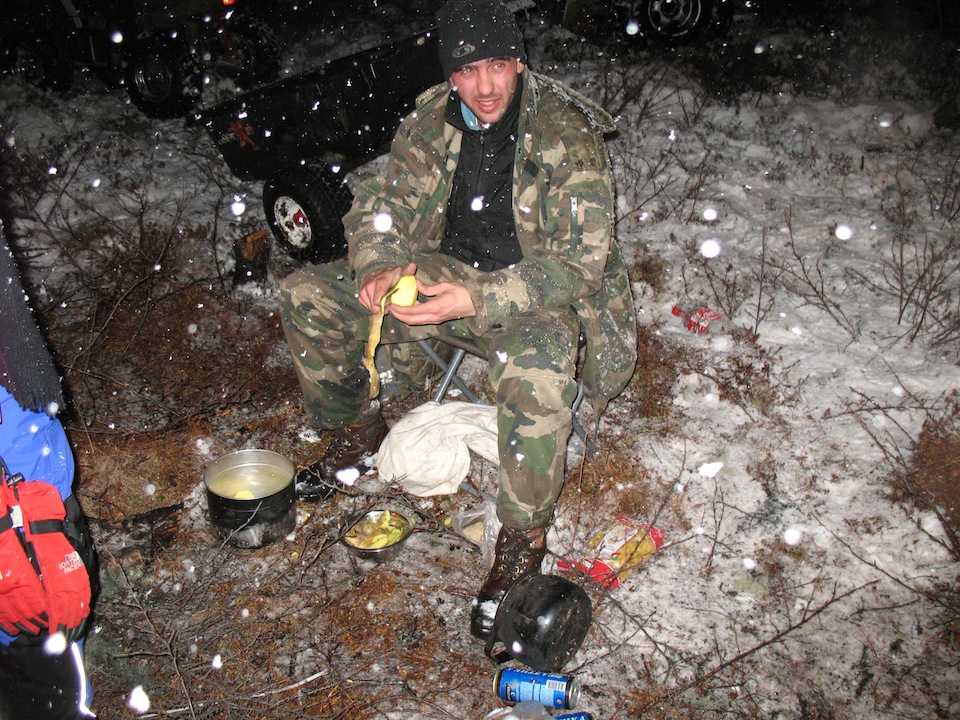 И тут нам круто подвезло). Проголодавшийся Kamaz вызвался на должность шеф-повара! Вован завел дэску, став в один миг монополистом и уважаемым местным Алигархом) впоследствии к его активам добавилась палатка, и он видимо предчувствуя это, резко заважничал))) ну по лицу видно - парня понесло, шучу)) просто так кадр попал) Вот такой вот у нас был сумасшедший пионерский костер!!! То ли на костер, то ли на висколу, подтянулись пионЭры, подогнали ящик пива на общак и понеслось)). Особенно жгли Эдиссонн и Вован. Ржали как лошади все))) наша квадроледи очень мило и сексуально врубала блондинку, всем понравилось)). Вован смонтировал палатку, решили ночевать в ней...) В летней, без печки, благо были хорошие спальники - не замерзли. Продолжение следует... |