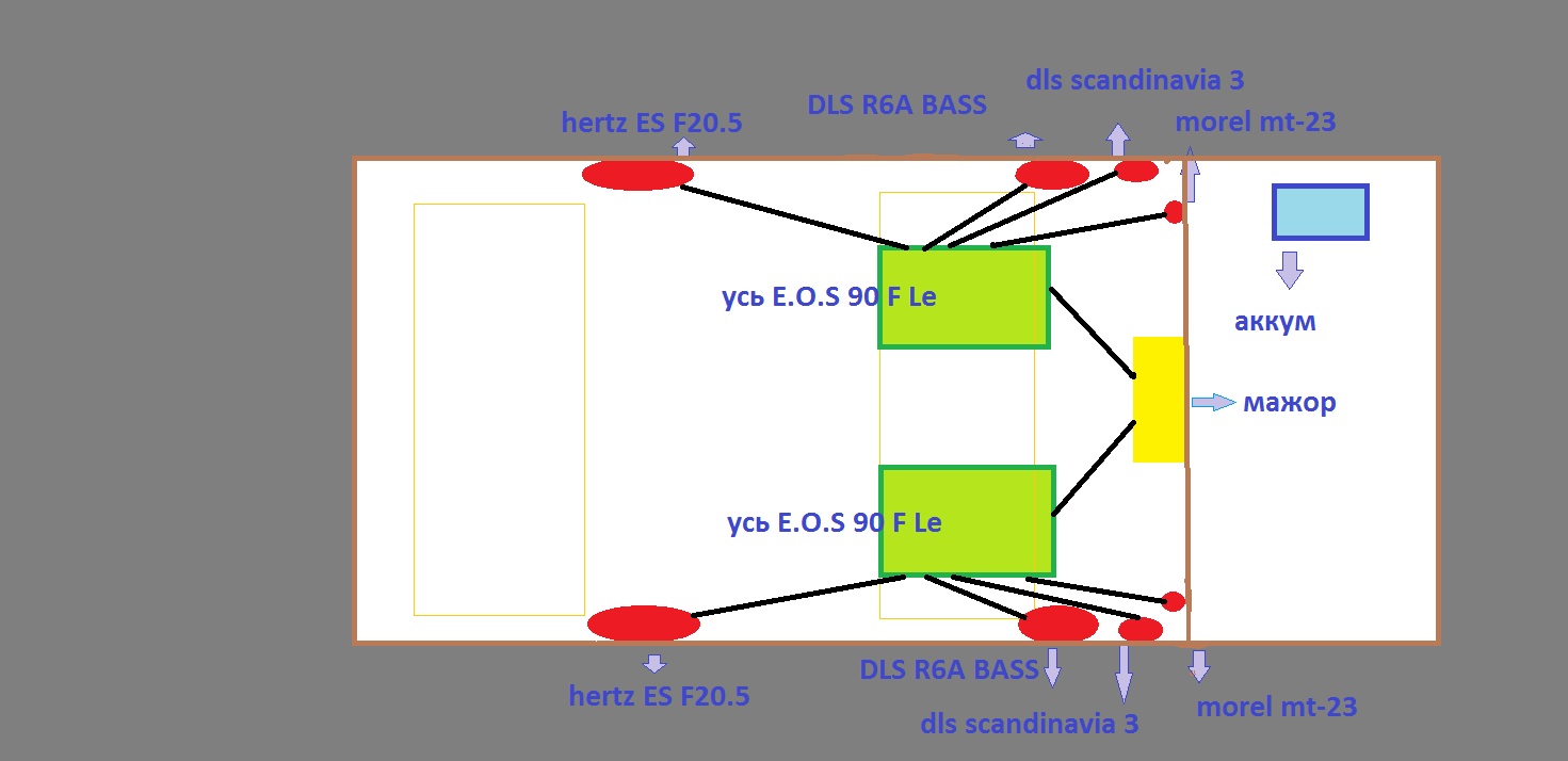 dissector и остальные посетители форума здравствуйте нужна помощь помогите подобрать конденсатор на сколько надо фарад на 2 усилка и провода и помогите со схемкой подключения начиная с аккумулятора авто у меня пикап голова будет PIONER DEX-P99RS на фронт хочу поставить 3х компонентку без кроссоверов пищалки MOREL MT-23 среднечастотный DLS SCANDINAVIA 3 нижний динамик DLS R6A BASS на тыл в задние двери в правую и левую по 8" HERTZ ES F 20.5 и запитывается аккустика 2 4х канальниками E.O.S 90 F LE я так понял называется подключение поканальное. Помогите со схемкой если не трудно и подбором конденсатора усилители будут стоять под передним правым и второй под передним левым сидениями.И еще вопрос как правильно на фронте поставить трехкомпонентку нижние динамики понятно в стандартные места а как правильно поставить среднечастотник и пищалки не знаю. а шумо вибро изоляция как же? -------------------- Я люблю жить.