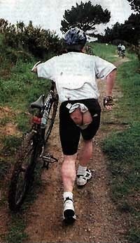 ду по достаточно широкому парапету ( сантиметров 50 где то), высота которого около метра и решаю с него запузырить... ну, значица, собрался достиг желаемой скорости, заблокировал переднее колесо, предварительно повернув его в нужную сторону... (кто не в курсе - зима у нас в Красноярске на дворе... ледок местами...)... Парапет-то и сам по себе скользкий - из какого то подобия мрамора да еще и на морозе - короче я это все учел и уже было совсем обрадовался, что все получается пучком - колесо заднее прошло уже около 1\5 целого круга - уже приготовился полностью оторваться от земли, как вдруг мое заблокированное переднее колесо начинает скользить как по маслу (кде-то умудрился на ледок этот самый и попасть...) М-ля! короче! Начинаю незапланированное приземление с попыткой использовать в качестве контактной точки свой, по инерции улыбающийся репник, в последний момент все таки передумываю падаю грудью на край парапета - велик же, падлюга такая падает на снег рядом с парапетом, а я ногами по инерции подпарапет ну и естественно съезжаю пузом вселд за ногами и падаю спиной на байк (граждане! катайтесь с рюкзаками за спиной! а то защита позвоночника зело дорогая)!! причем, что самое интересное... я уже учен горьким опытом неоднократно, что если пытаешься повытяпываться перед симпатишными девченками то обязательно облажаешься!... так вот! я специально огляделся перед трюком нетли никого по близости... никого не было... однако стоило мне закончить мой мега-супер-ультра-трюк как я услышал заливистый девичий смех Кстати вспомнил еще одно ненавязчивое падение. Цэ случилось прошлой зимой. Еду по пешеходной дорожке, ширина ее от проезжей части до здания где то метра 4 - 5... Вокруг редкие пешеходы... Вижу прямо по курсу участок чистого льда - замерзшая лужа размермами типа 2х2 метра. ну я качусь, не делаю резких движений. Подъезжая к краю льда (готовясь на него въехать) вижу что мне на встречу подходит какой то пассажир (у противоположной кромки льда), ну я приняв его во внимание решил заранее отвернут чуть в сторону, чтоб чего не вышло... И вдруг, когда мы с этим меном были на расстояни вытянутой руки, он вдруг резко выкидывает в мою сторону свою правую руку и цепляет мой кроскантрийный байк за Рог (РОГА - это плохо..... ). Я даже пернуть от удивления не успел, как сровнял нос с общей поверхностью лица о ледовое покрытие (катайтесь зимой в хоккейных вратарских касках!! ). Ну я естественно, потрепыхавшись как корова на льду (гы!..) вскочил, и недолго разбираясь вломил гражданину пару Pedal-Kik'ов по почкам (меня еще подогревали искренне возмущенные возгласы прочих прохожих видевших это)... в ходе отоваривания гражданина из его невнятных и обиженных реплик я понял, что он во первых пьян (собака, а во вторых: "Зёма, я... это... хотел поздороваться... давай поздороваемся..."... Тут я не выдержал еще раз,и понял,что если не отправлю дядю в серф по льду, то можно считать: все, что жил - то зря! Тока я ногу отрываю от подлежащей поверхности... и тут, падая вспомнил что я еще одной ногой стою на льду... Дядя правда тоже рухнул, так как я его достал-таки... Редкие пешеходы радостно загомонили... Правда это падение было не со мной ,а с моим железным другом, тогда еще китайским. Ехал я по проспекту и тут девчёнки машут, дай мол покататься .Ничего не предвещало беды. На прокатись , не жалко. В это время тусуюсь с ее подругой и з