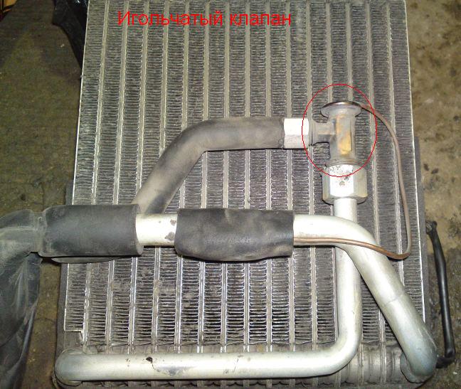 В общем для утепления в машинке было решено ампутировать радиатор кондиционера (который внутри салона) и сделать его печкой... достать радиатор не очень сложно.. находит он под барбачком, там надо всего лишь снять бардачек, открутить вентилятор печки и собственно снять радиатор кондера, предворительно отсоединив от него шланги и открутив болтик со стороны двигателя... на самом радиаторе кондера (далее по тексту РК) надо убрать игольчатый клапан (в красном кружке на фото), его можно высверлить... но т.к. до клапана идет трубка меньшим диаметром, нежели после клапана, было решено убрать этот кусок трубы (решение на мой счет не верное, но только потом это осознал)... и соответственно протянуть оттуда шланг наружу, для подключения к системе охлаждения... далее подогнули патрубки (стрелки на рисунке), чтобы удобнее вернуть на место радиатор, собрали корпус радиатора, подпилив немного отверстия... и пришлось пилить кузов, место где выходят в подкапотное пространство патрубки с РК.. т.к. на место не вставали... (поэтому решение убрать кусок патрубка было не правильным)... ну что сделано то сделано... поставили все на место... у токаря заказали штуцер на второй патрубок (большой) и когда начали подключать.. оказалось что не хватает шлангов... в общем пока до конца не доделал (осталось только подключить)....