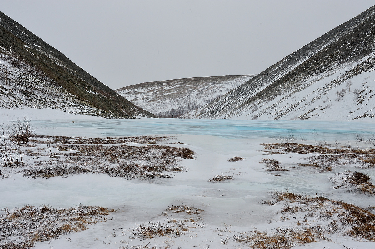 Цитата(DvK @ 24.3.2013, 1:47) ссылка доступна только зарегистрированным И вот что получилось: ссылка доступна только зарегистрированным В 9-15 на шашлычке было два викинга и я. Чуть позже подъехал Николай на пикапе с Ямашкой. Выехали на 10 минут позже намеченног срока. Когда пересекли Дукчу и углубились по заметенному путику в лес, начал один снеж валиться, плюс с Николаем связался Денис Асс, прилипший где-то до ГАИ. Ямашка ушла спасть Асса, как я понял. Далее мы двинули втроем. Местность знал, вел по своим же тряпочкам на деревьях, до Лесной Школы везде по старым дорогам и просекам. По верхам хорошо задувало и заметало, потому не до фотографирования было как-то. Кстати, в первый подъем за ЛЭП я вышел в одного без остановок, а вес у кота с полным баком, канистрой и шанцевым инструментом - как у сухой Прошки. Был вторым по сухому весу. На одном из озер откопали встреченный домик, сели чай попить укрывшись от ветра, там нас и нагнал Дима Двк. После озер срезали до старой дороги, которая начинается на 28 км осн. Трассы и ведет на пос. "Дробь" ("32/30" или пос. Верхний Сердях на картах). По пути к остаткам поселка, на который даже некогда ходил рейсовый маршрут, поднялись на приметную отдельно стоящую сопочку, с останцем на вершине. "Каменная Баба", "Сердяхский Идол" и т.п. названия приписывают этой формации Пока двигались правым краем полей, решали куда бы можно было бы заехать с бОльшим толком и меньшим расходом топлива. Пропустив два поворота, которые ведут под вершину 1367 м. Решили попытаться перевалить в истоки р. Уптар. Группа в начале подъема, на фоне едва проглядывающей через снег вершины 1367м "Пик Танкистов" Это "Двойная Уптарская Пирамида", вершина к западу от ПТ. Почти доехал до гребня, но снег кончился совсем. По стланику тоже можно ехать, но компания остановилась далеко позади ранее. Вернулся на снег выпилив лыжи из стланика. Вернулись и перевалили в долину Уптара через "Олькие Ворота", на том перевале еще косой балок стоял. Попили еще раз чай, причем колбасу, сало и сладкое грызли многократно жаднее . Нагуляли аппетит Пересекли долину Уптара и заскочили на Чертово Ущелье В ОБХОД НАЛЕДИ, через перевал. Заехали не без труда, а траверсируя его, перевернулся пару раз на застругах+общий уклон склона. Ставить на лапы пришлось через руль, вниз по склону, зажав тормоз. Штрааашно - вдруг так и покатится... только листвяны и остановят тогда его В цирк "Чертова Ущелья" мы заехали по ручью справа от моренного вала. Удивительно, но на верху, в цирке, сотворенном древним ледником был почти штиль, по сравнению с основной частью маршрута. Вышли с него через пологий перевал слева по ходу движения. Спустились по лесистому распадку и закруглились по ручью вдоль столбов старой телеграфной линии. Обратно с ЧУ вернулись через наледь. От пос. Уптар срезали по лесу на ЛЭП220кВ, где заправились с канистр Викинги и отлил 10 л бензина из бака Диме и поехали биться вдоль ЛЭП. Тут я уже почувствовал, что "приехал", и в прокладывании путика практически не участвовал, пасмурно+сумерки=мало фоток. Расход по такому снегу конечно дикий, особенно у авангарда. Но заезда на сокольскую заправку мы избежали (хотя не скрою, переживания определенные были, и грела мысль, что позади идет группа с некоторым запасом топлива, да и остаток маршрута весь вдоль трассы) Я свои 65 литров так и не пополнял из заначки, а даже н