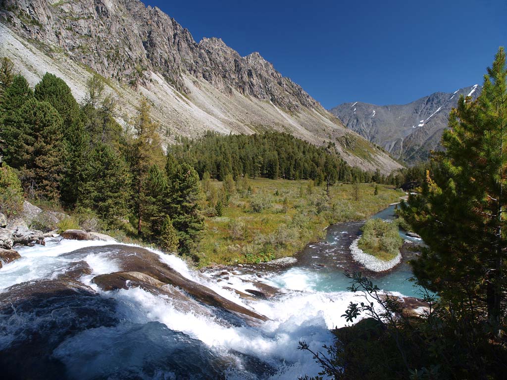 29 августа. Переходим реку впадающую в озеро Кучерлинское сцепками по 3 человека. Вода леденющая. Иду в кросовках. Ботинки привязаны сзади рюкзака. Погода шепчет. Солнечно. Период для похода выбран правильно. Дальше почти все дни солнечно, красочно по осеннему. Цвета просто сказочные. Впереди нас ждет открытие. Тут даже лошади не ходят поскольку лошадей альпинистов просто не существует. Подымаемся вверх вдоль водопада и тут оказывается что надо лезть по вертикальной стене с рюкзаком и без всяких страховок. Я шел последним из-за фотосъемки. Когда дошел, спрашиваю а как тут типа девченки то подымались? Да нормально, давай мол лезь