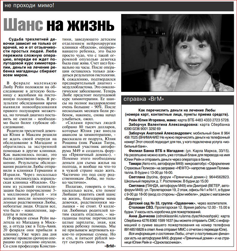Теперь вот со знакомым... У дочки нашей однофорумницы обнаружили в Магадане образование правого полушария мозжечка, ничего более пока сказать не смогли, нужно было обследование посерьезней. за 2 дня нашли информацию, связались с клиниками, где не надо было собирать долго кипу документов, вылетели в Тель-Авив. Их приняли сразу же и на следующий день девочку оперировали. Это сайт клиники ссылка доступна только зарегистрированным Обновление информации. Люба Рейн. 3,5 года. Диагноз - медуллобластома. Уже прооперирована. Необходима химиотерапия - 3 курса, общей стоимостью 120-140 тыс долларов, 80 тысяч за химию уже внесены, во многом благодаря сборам магаданцев.. Пункты приема средств и номера карт, куда можно перечислить деньги на лечение Любы. Контактные лица, располагающие меддокументами (это для тех, кто желает помочь от предприятий): Рейн Юлия Игоревна, мама: Карта ВТБ 4483 4333 2723 5728 Заборчук Валентина Александровна: карта Сбербанка 6390 0236 9001 3292 69 Заборчук Анатолий Александрович: Мобильный банк 8 964 456 7025 (ВНИМАНИЕ! Не нужно перечислять деньги на телефонный номер! Это способ подходит для тех, у кого подключена услуга "мобильный банк" - инструкцию ищите в комментариях). Филиал Банка ВТБ в Магадане: пр. Карла Маркса 33/15. На ресепшене можно взять уже готовый бланк для перевода на имя Юлии Рейн и отправить деньги через оператора в банке. Тамара (Авто-кто): Микроавтобус "Оформление Страховых Полисов" на заправке "НЕФТО" напротив здания Полиметалла. В будни с 13-00 до 16-00 Светлана (bycina): 9644562823. Школьный переулок д. 7. Ростелеком. В будни до 15-00 Светлана (ПАНДА) Дмитрий (ВЕТЕР) Пролетарская 19, 2 этаж, офисы №1 и №11, в будни с 9-00 до 18-00 (вход со стороны "Дом Мебели", рядом с магазином "Винорум") Детский сад № 33, группа "Одуванчик", воспитатель Столовая СВЗ. Пролетарская 12. Время работы 12-00 - 15-00 в будни. У кассы есть коробочка для пожертвований. Анна Дьячкова odnoklassniki.ru/anna.dyachkovashpak Карта Сбербанка 4276 8360 1599 1637 Следом можете отправить смс с информацией о сумме вашего пожертвования на номер телефона 89148516828 в ответ Анна отправит ммс с отчетом о переводе Юле. Ольга Степанова odnoklassniki.ru/profile/545468489328 Группа в одноклассниках - ссылка доступна только зарегистрированным Тема на Пряничном домике: ссылка доступна только зарегистрированным Тема на Магспейсе ссылка доступна только зарегистрированным На "Пряничном домике" мы запустили небольшой благотворительный аукцион. Деньги пойдут переводом на карту Юли. Девочке очень-очень нужна наша помощь. И пожалуйста - эта тема для помощи, а не для обсуждений. Спасибо за понимание. Сообщение отредактировал БЯКА - 10.3.2013, 18:35 -------------------- Нормальные девушки сидят "по стойке смирно", судорожно вцепившись в руль, олицетворяя своим видом механика-водителя танка, идущего в атаку. На лице - ярая бдительность агента КГБ времён холодной войны (искоса бросаемые по сторонам короткие, но пристальные взгляды, типа "на чью мельницу воду льёшь, гражданин, а?")... (С) jey |