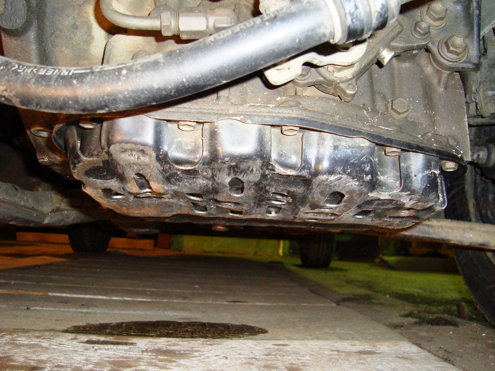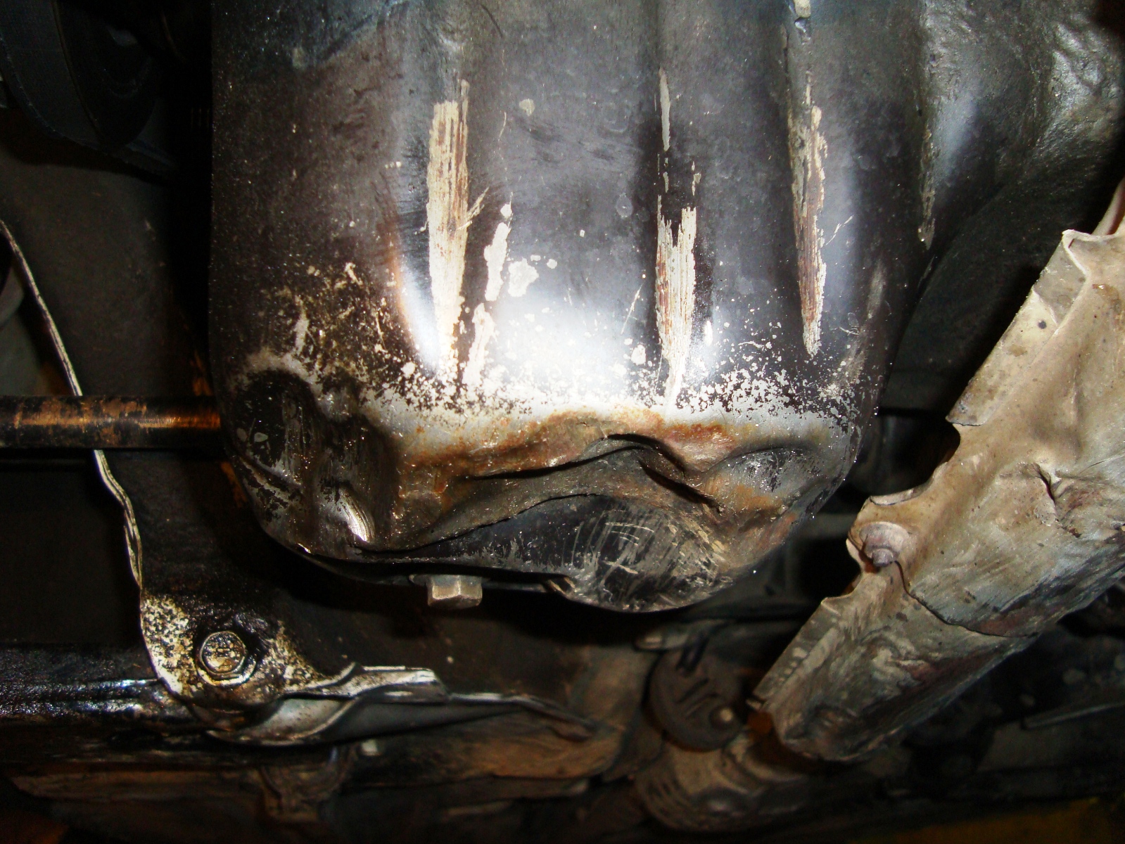Собственно вот фото, насколько плохо, можно ли понять замят ли там маслоприёмник (фильтр акпп), смогу ли сам снять поддон двигателя, каких то сложностей там нет? сомнения есть смогу ли открутить выхлопуху... выстучать сам смогу или лучше к спецам обратиться? не покоробит поддон в процессе выстукивания, что масло держать не будет? 4Е-FE, вроде ездит, лампа давления гаснет, и коробка переключается, нормально или нет не знаю, сравнить не чем. Поддон АКПП не промят на столько чтобы к маслоприемнику достать, да и у него защита посерьезней! А вот на ДВС прям смачно, как минимум на количество вмятого объема будет меньше масла в ДВС (если заливать по масляному щупу). Поддон врятли поведет, ну если вы только на пресс его класть не будете, но как вариант может метал в местах послабления лопнуть, я у себя когда рихтовал вмятину от сильного удара вскользь, в процессе рихтовки в том месте лопнуло, пришлось проваривать! Главное рихтануть так, чтобы потом при первом же любовном шоркании по бордюру из двигла не вытекло масло, может пластину наварить, а это уже к мастеровым... В данном случае, нужно беспокоиться не о короблении поддона в местах крепления к ДВС, а его целостности как ёмкости! -------------------- Спасибо! — HILANDER