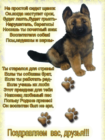 Всех собак, их дрессирует, Кто кинолог по призванью: От души, не по названью! Мы желаем вам удачи, От труда большой отдачи. Пусть всегда вам будут рады Псы-дворняжки, псы с наградой! Будьте счастливы, успешны, Жизнь пусть будет интересна: Тренировки, воспитанье, И в ответ - хвостов вилянье! -------------------- Стерилизуйте дворовых и домашних любимцев!