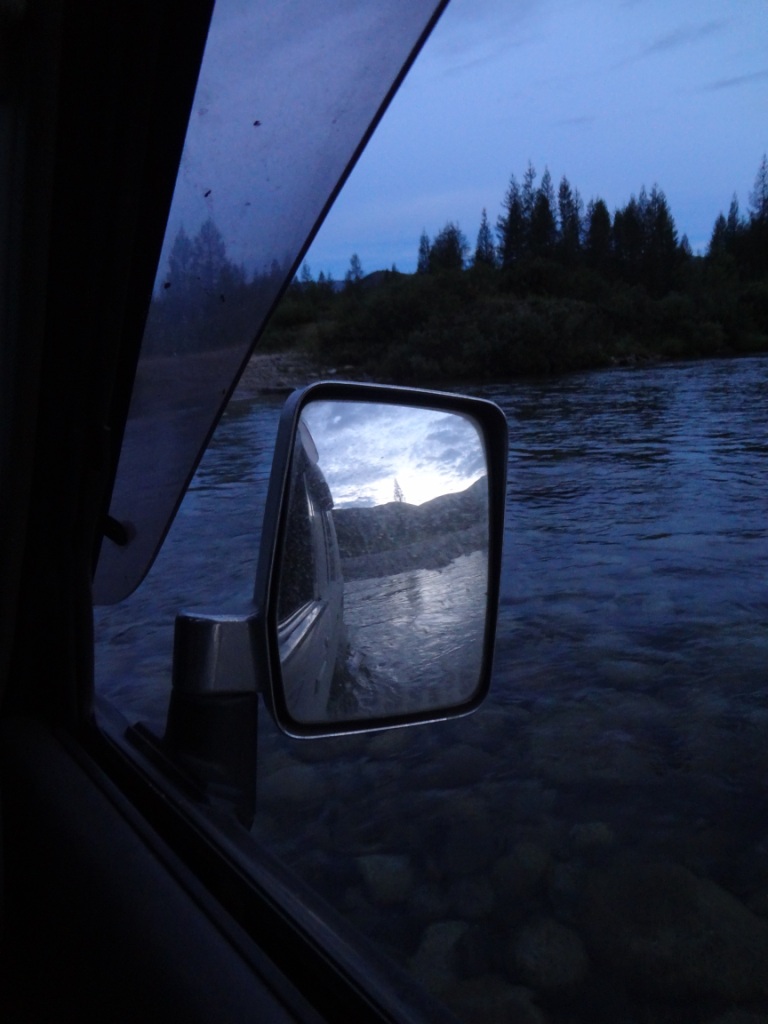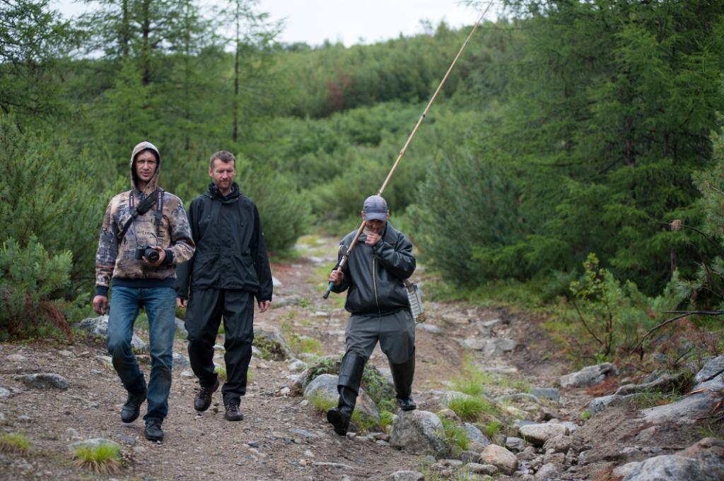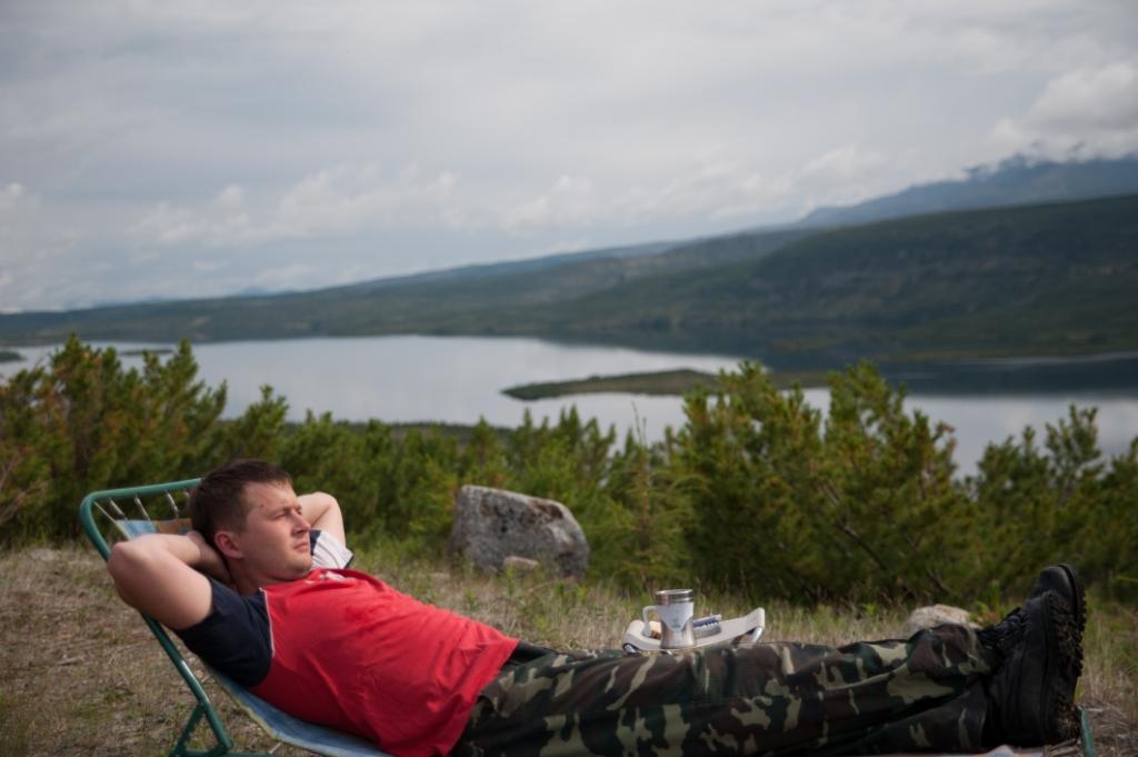 Приехали, сразу фотик в руки и пара фото. Обитатель к слову на момент нашего приезда был там только один, Александр. Пока ставили лагерь готовили кушать подъехала еще машина и подошел мужичек, разговорились, спрашивал про оружие. В ответ когда услышал что основное наше оружие это килограмм двадцать фототехники посмеялся и представился, местный егерь. Проверять машину не стал, поверил на слово что нет у нас оружия. Пожелал хорошего отдыха и уехал по своим егерьским делам. Ну а мы, ням-ням и буль-буль...... Разговорились с Александром. Рассказал что машина ходит обычно в пятницу из Ягодного, в суботу с озера. В лагерь детский продукты завозит и туристов вывозит. 2 дня назад машина ушла, вывезла с озера двух мототуристов из Якутска и Ленска. До озера они сами добрались, ну а выбраться у них сил уже не хватило, погрузили их в Камаз и вывезли с озера. И сегодня УАЗ и Буханка ушли утром (которых мы по дороге встретили). Об Александре... Ну а мы поев, выпив и познакомившись решили осмотреться. Штурман завалился спать, а велосипедист Виктор на рыбалку собрался. Ну а я на озеро не спать приехал, попросил у Виктора помощи снасти подготовить(за что ему спасибо) и с ним на рыбалку рванул. На хариуса первый раз в жизни пошел. Ох и намучался я с этой рыбалкой. То леска в ветках запутается, то крючек за ветки зацепится, постоянно, с островка на котором стоишь, норовишь в речку бультыхнутья. Ну в первй день япоймал кое-как 6 хвостиков и то 5 из которых больше на кильку похожи по размерам чем на хариус. Постоянно с крючка рыбка срывалась, Виктор показал свои мушки, они двухкрючковые(как тройник, только двойник) а у меня одинарные крючки, что в магазине посоветовали....Ну да ладно, не в рыбе счастье, а в процессе. Половил немного (2-3 часика) и марш в лагерь, надо к ночевке готовиться. Да еще и дождик зарядил. С погодкой нам надо сказать не повезло. Каждый день во время поездки что-то да капало. И вот идуя к лагерю, Виктор остался еще порыбачить, а сам как мельница руками махаю, от комаров отбиваюсь. КОМАРЫ!!!!! это самое яркое воспоминание о путешествии. На озере они вообще дикие, не управляемые, злобные и кусючие. Они даже фотоаппарат у меня покусали....Их не берет никакая комаринка, с собой видов 5 комаринки было, более чем на 5-10 минут спокойствия не появляется, только дым от костра немного развеивает тучи этих кровососов. Добрался до лагеря, губа опухла, руки опухли Штурман дрыхнет, Александр тоже, Виктор рыбачит, скучно. Костерок и всех будить.... Мясо жарить и вино пить. Вы что спать приехали!!!!! ну так в беседах, под винчик и мясо и закончился первый день пребывания на озере. Виктор вернулся, 15 хвостов хариуса поймал, размером с ладонь и более. А теперь СПАТЬ, СПАТЬ, СПАТЬ. Виктор и Александр в домике, а мы с Владом в машине. У Виктора с собой ничего нет, выдали ему подушку и одеялко, у Александра свой спальник, ну и мы по своим спальником и в царство Морфея. Стук по крыше, дождик капает своей барабанной дробью и медленное пробуждение в реальность. Это не сон, мы и правда приехали, а погодка не радует. Капает, все в тумане. А ЖРАТЬ то хочется и по делам после ночки вставать надо, а то спальник замочится..... Выгребся, утренний моцион, и что-то съесть. Кофе, сырок, колбаска печеньки, и вроде как жизнь продолжается. Только зябко и сыро. Надо печку протопить, а там все течет и капает. Ну да ладно 4 взрослы