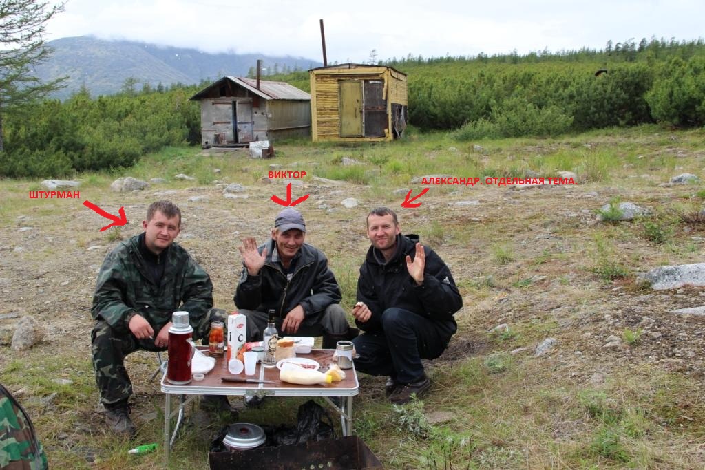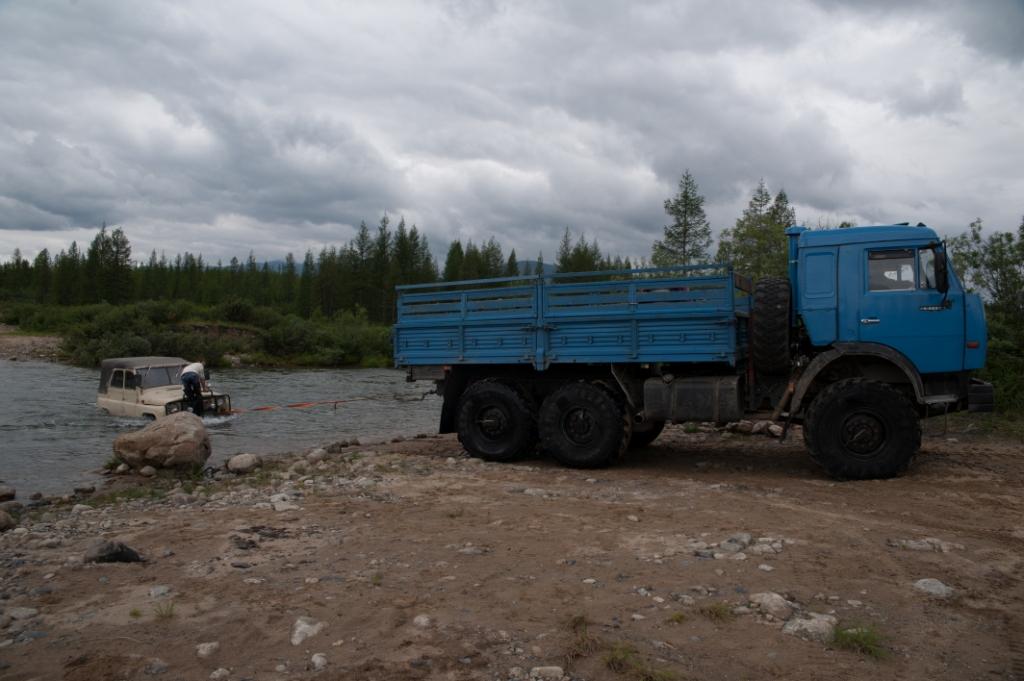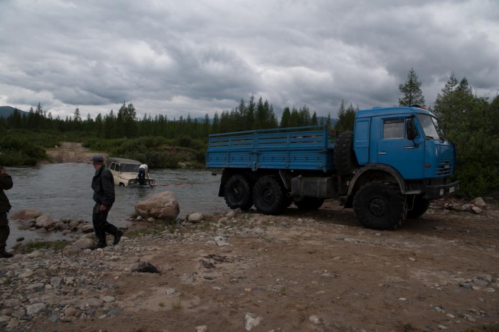 С чего начать... Ну наверное с еще раз высказать благодарность Сергею из Ягодного за спасение нашей экспедиции из так бездарно встрявшей на ровном месте и приложить фото Сергея, его дочурки, моего железного друга ну и меня соответственно, Ну что сказать о дороге, ничего страшного пока нет, обычная плохая грунтовка с ямами полными воды. Поднялся на бугорок - спустился в ямку с водой, поднялся на бугорок, по началу думали каждую лужу мерять, но когда поняли что они через каждые 50 метров, решили только те мерять, что наиболее опасными кажутся. Так мы и ехали первые 16 км. Реально опасным было только одно место, дорога идет вперед прямо в небольшую лужу, но почему-то в право идет через бугры другая объездная дорожка, бугорки и правда крутые, можно легко днищем терануться, подумав, решил что в воду не хочу, буду скакать по буйракам(как оказалось в дальнейшем, после общения с местными водителями, решение было абсолютно верным, в этой маленькой луже Камазы вязнут на ура....), так мы и добрались до ручья Красный, штурман в это время уже монотонно посапывал на бугорках (хорошо ему, пивко освежающее в дороге видимо притомило). Итак, мы подъехали к ручью Красный. С виду маленький, разлившийся ручеек, таковым он и оказался. Прошли его не меряя и не напрягаясь и двинулись дальше. Дорога все такая же, грунтовка с ямами полными воды, объезда нет, с боков тундра, только вперед.... По рассказу Сергея на 21-м км серьезный брод, надо быть аккуратно, вот и мы где-то рядом,выезжаю на очередной бугор и вижу эту речушку, и какой-то темный силуэт на берегу. Первая мысль - "МЕДВЕДЬ".... Подъезжаю ближе и вижу за бугорком костерок, медведи костры пока еще не научились разжигать, подъехав еще ближе различил человеческую фигуру ремонтирующую велосипед. Остановился, вышел поговорил с мужиком, оказывается Виктор из Ягодного с велосипедом держит курс на озеро рыбки половить.... А говорили что я "экстремал", камеру ремонтирует, да чаек разогревает чтоб погреться да взбодриться, шутка ли 21 км. велосипед на себе тащить!!!!! У нас машина полная бутора, реально только два человека поместятся, спереди. Поговорили и говорю ему: "Извини мол, взяли б тебя, но в машине места нет, да еще и с велосипедом.". Он кивнул головой и пошел чай пить, ну а я толкнул штурмана и пошли брод мерять. Там глубоко, там глубоко, там каменюки большие, сяду на них. Ходили, меряли смотрели, но надо и дальше двигаться.... Решил идти тут, между валунами проскакивать. Штурман в воде, дорогу смотрит, я в машине газую. Потихоньку тронулись, путаюсь лавировать между валунами под водой, что-то чиркнул передним мостом.... и чувствую машина уже не едет, она плывет, нос течением поворачивает..... и тут из под заднего моста легкий скрежет, машинка наклонилась на правую сторону и нос еще сельнее течением повернуло и новый скрежет со стороны переднего моста..... СИДИМ... Вышел, посмотрел где что и как сидит, как крутится... Едем дальше, говорили что на 36-км будет еще засадные места. Ну так оно и есть. Лужи глубже, объезда нет, дно илистое. Встречаются ручейки с крутыми берегами и камушками размером с пару шлакоблоков. Догоняем Виктора с велосипедом, помахали друг другу ручками, про себя думаю: "Ну не прав я, в глухой тайге человека не подобрать. Ну он же местный, знает куда идет и что делает.". Пройдено примерно 36 км. из 54-х до озера. Едем дальше, очередная очень 