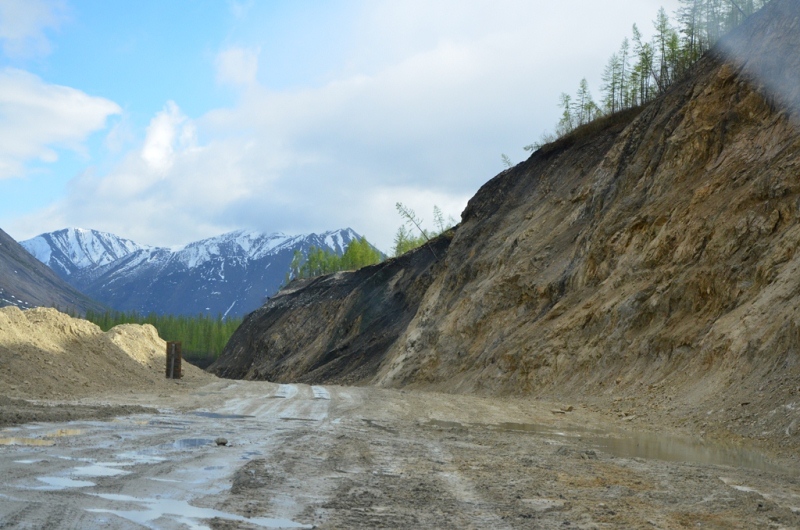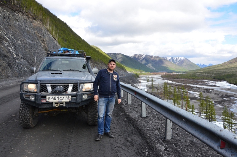 Ночевали около шиномонтажки напротив АЗС в машине, даже спальник от стоявших на нем коробок освобождать не стали. Хозяин на телефон не отвечал, хотя номер был записан крупными буквами на здании (да и местные жители сказали звонить ему в любое время). Наступило утро. Поменяли спущенное колесо на запаску. Объехали еще 2 места, но все было закрыто. Где-то около 11 утра на одной шиномонтажке, что находится ближе к выезду из поселка, за 150 рублей купил пинцет и заделал шнурком пробой на спущенном колесе, висевшем уже на запаске. Сразу двинули в путь дальше. Индигирка была мутной и полной воды (буквально через 2 дня в новостях по радио услышали, что река топит прилежащие к ней районы). Туман поднимался по сопкам. Ольчанский перевал заворожил меня уже второй раз, на нем сделали не-сколько фотографий. На перевале обнаружил, что подклинивает левый хаб-автомат. Мозги крутить он начал еще в Магадане, когда в положении «Авто» был включен. Тогда не придал этому особого внимания, т.к. откатился назад, и он отключился. Кроме того начал сопливить левый кулак. Еще при переборке моста и замены пар с установкой блокировки в конце лета 2013 года новый сальник несколько пропускал масло, однако на тот момент в запасе сальника не было. Критичного ничего не обнаружил, двинулись дальше. Р. Эльга была также полна воды. Дорога пошла на троечку-четверочку. Попадались разбитые дождем ямы, крупные торчащие камни. Но скорость держалась 70-100 км/ч. На сопках начал по-являться снег. На свороте на старую Колыму в районе Кюбюме заправились на АЗС. Многие критикуют данную заправку, но рискнул второй раз, как и 4 года назад. Цена на топливо ниже магаданской (одинакова с Теплым Ключом) – чуть более 37 рублей за литр. Топливо оказалось на хорошем уровне. Через р. Кюбеме ведется строительство моста в завершающей стадии. Вдали виднелись сопки Верхоянского хребта, все в снегу. Весна еще только зарождалась в этом районе. Дорога стала превращаться в горную, одноколейную. Прошли «Заячью петлю». Сразу начался свой микроклимат – снова зеленые лиственницы, солнце. Появились дорожники, ведущие активно работы на «Черном прижиме». Объем работ впечатляет. Строится новый мост, расширяется дорога, снизу бурлящая р. Восточная Хандыга. Конечно, по сравнению с четырехлетней давностью не такой уже здесь колорит, но все ж «Черный прижим» остается одним из красивых мест «Колымы». Далее последует череда фотографий данного участка дороги. На «Желтом прижиме» работы меньше, да и порода сама по себе более мягкая. Расширили его основательно. За «Желтым прижимом» меняли трубу на дороге, экскаватор сломался, а ПРМ не могли вызвать. В результате возникла пробка с обеих сторон. Постояли минут пять, и я пошел посмотреть объезд. На расспросы дорожником придется ждать часа полтора-два, объезда нет. Выше была тракторная дорога и сделана дам-бочка через ручей. Минуя стоявший УАЗик, пошли через эту дорогу, спустились к ручью. Ручей перешли свободно, на блокировках перелезли через дамбу и потом выехали на дорогу под удивленные взгляды окружающих. До Теплого Ключа доехали к 19 часам вечера. Дорога то хорошая, то отсыпанная подготовленная к ремонту не очень. Через р. Росомаха, на которой завис 4 года назад, построен добротный мост. Такие же мосты и через другие ручьи, которые зачастую обозначены просто километражом дороги «Кол