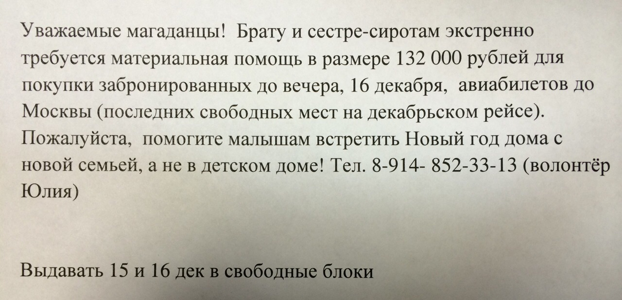 У меня потрясающие новости! Благодаря одной знаменитой приемной маме, автору книги "Если б не было тебя", Диане Машковой, у нас появилась отсрочка и 4 нормальных билета эконом-класса. 39 881 р - взрослый билет 21 381 р - детский билет Бронь продлили до пятницы. До 14-00 19 декабря осталось собрать 71 500 рублей Под Новый год случаются чудеса! Блин, вот проводим, я точно напьюсь до поросячьего визгу. -------------------- ☺