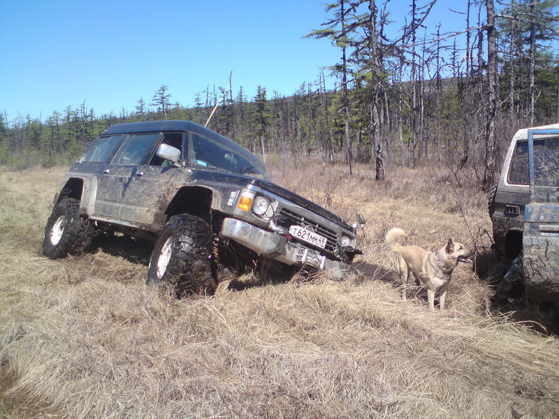 Утром - те же яйца, только в профиль. На выезде с ночевки в первых же двух лужах погнули якорь под прямым углом... Ну чтож, положили в машину как трофей. Теперь наши друзья - еще и бревнышки (вы наверняка на обратном пути видели эти лужи с бревнами, оттащеными чуть в сторону). Дальше до перевала прошли все спокойно, практически нигде не застревая, объезжая все зачадные места. На перевале сделали привал для пообедать, оттуда и фотографии. Спустились легко, нашли какую-то дорогу, ломанулись по ней. На выезде к полям вспомнили что (ах, да) у нас в машине согнутый якорь, поэтому нам нужно половину леса привезти на поля с собой. Нашли какое-то обгорелое деревянное сооружение в кустах (что-то типа волокуши), начали разбирать. Тут откуда ни возьмись - Рыбакоп с Паджеро959, мы за ними) Пока они качали колеса, постояли с ними, узнали что до самых говен мы все-таки не доехали (обидно, да Ага, еще на обратном пути по Ольской трассе от тряски слетел крюк лебедки, пролетел под колесом, через полуось вескочил назад, в полете царапнул крыло, отколол кусочек с поворотки, оставил вмятину на кенгурятнике и зацепился за бампер Теперь точно все. (чукча не писатель..не бейте больно за мое невнятное изложение) -------------------- Добро и пофигизм.
