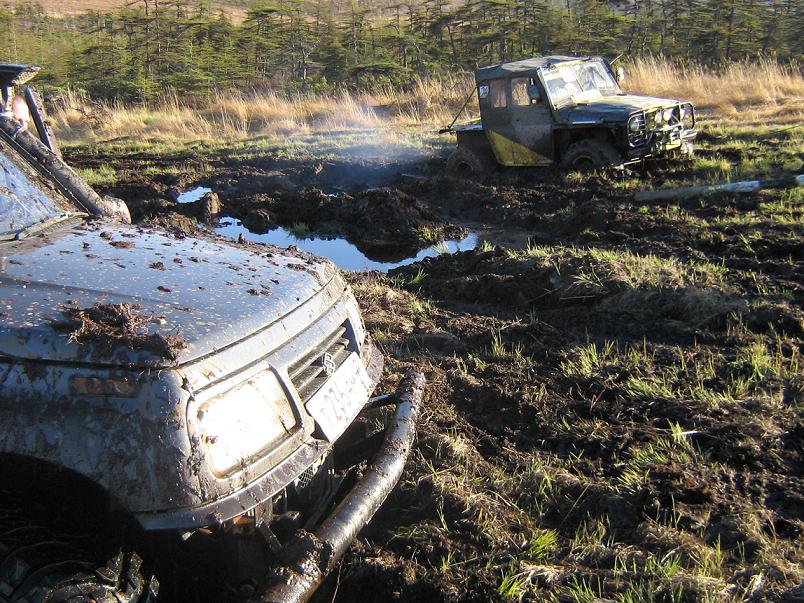 выехали в субботу в 5 утра от Стеллы. Оттуда на Ольские поля, быстренько их пересекли, упали в Адыкчан, на Скотобойне нас догнали Норд-трофи, пожелали удачи и поехали дальше. Летом по этой дороге никто из нас не ездил, так что ехали чуть ли не наугад, в итоге очень много времени потеряли в ямах, которые не смогли объехать. затем у Сергея начались проблемы с рессорой - согнулась и из-за этого серьга постоянно "запрыгивала" назад и рессора упиралась в раму, правда мы быстро научились исправлять её положение хай-джеком. Но домкратили мы крузака много раз. Часам к 5, когда мы были где-то на траверзе Чистого, дорога нам казалось просто бесконечной и не знали, где же у неё конец. Снова не нашли объезд ямы - в итоге ещё час работы лопатами, домкратами, лебедками в глине. Вечером достигли так называемого "переезда" - врезной ручей, шириной всего метр-полтора, несколько раз пытались взять его штурмом, передом, задом, боком, наскоком, медленно. В итоге нашли очень узкое место (полметра шириной и метр глубиной), заложили его сушняком, стоящим вокруг и переправились вообще без проблем. К 11 часам вечера были на берегу Чистого. Нас даже салютом встречали. Оказывается, там уже собирались делать тотализатор - доедем или нет. А мы взяли и доехали. Самый полный комментарий, что я там услышал "Обосраться"... Поели ухи и полночи разговоры у костра. С утра ремонт: 1. Срезало шпонку на лебедке у Сергея. В итоге у него осталась одна лебедка сзади - русский "Спрут", мы её растягивали раза 4, но все заканчивалось тем, что подгоняли Сафарик и заканчивали дело им, ибо жутко медленный наш "Спрут". 2. У Эйвана рулевой редуктор оторвался от рамы. в итоге люфт рулевого колеса составил где-то 360 градусов. Замотали проволокой, т.к. сварки не было. в принципе и все. Часа в 3 в субботу легли на обратный курс. Теперь уже тщательно выбирали дорогу, искали объезды - в итоге скорость получилась достойной, пока в очень мокром месте рессора Сергея не сказала "дзынь". Менять рессору, когда у тебя ноги засасывает по щиколотку - мало приятного. Плюс Сергей очень усердно приварил скобки, удерживающие листы от расползания. Так что ещё пришлось в полевых условиях рубить металл зубилом. Проволоки на рулевом Эскудика хватило на полдня. Потом все началось по новой и становилось лишь хуже. Думаю, Ваня, все сам расскажет. Часам к 11 где-то на пол-пути до Чистого разложились на ночлег. Короткий сон и снова в путь. Снова объезды, лебедки, троса, грязь, торф, вода. Закрываю глаза и вижу болото до сих пор. Борясь с мелкими и не очень мелкими поломками (снова переборка рессоры ещё на пару часов) и часам к 4 мы на Ольских полях. От Олы до Магадана скорость 30 км/час была максимальной - на большей Эскудо становился неуправляемым. По городу до места ремонта - 10-15 км/час. Это была ОЧЕНЬ долгая дорога. P.S.: на мой взгляд время для поездки было выбрано очень удачно. Ещё через пару недель вся тундра там поплывет, ибо мы ехали по замороженному грунту. Было тяжело, но после хорошо дождя станет Безумно тяжело для наших авто. Так что мы успели сгонять на Чистое и записать в свою доску трофееф это местечко. -------------------- 89148508740