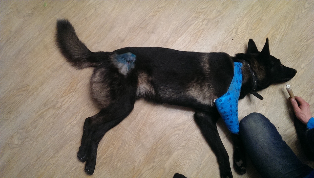 Ротвейлер, хвост купирован, правый глаз поврежден.На вид домашний, видимо попал под машину. Задние лапы функционируют плоха. Пес третий день лежит в первом подъезде дома Берзина 3.