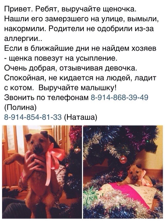 Просим откликнуться людям которые могут приютить или забрать на совсем. Контактный телефон: 89248520801 Галина, 89246926908 Эдуард |